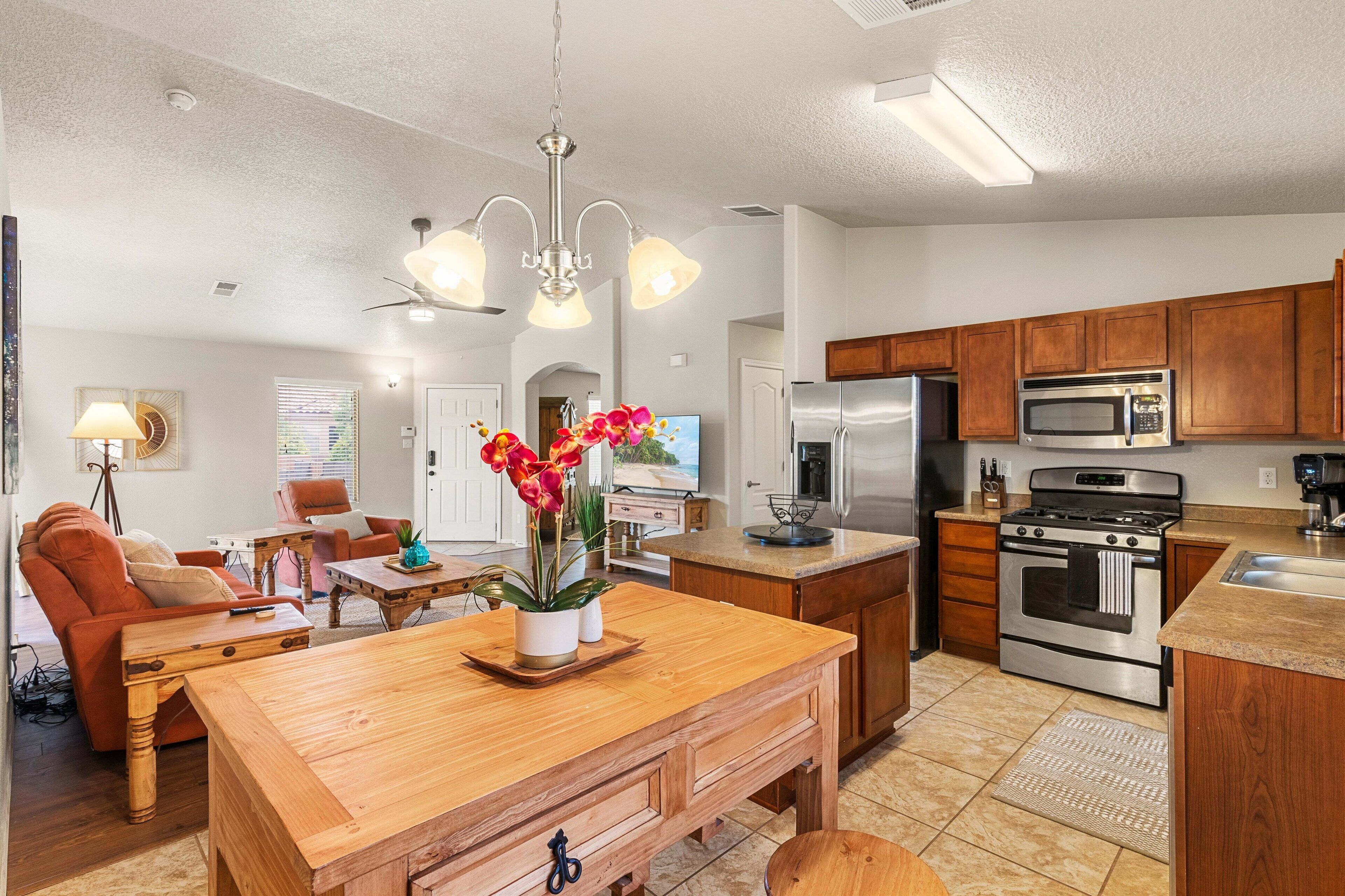 Inside, prepare all your favorite dishes in the well-equipped, eat-in kitchen and then dine at the breakfast bar or the dining table for four - perfect for family game nights! After meals, meet up in the living area to stream all your favorite channels on the smart TV.