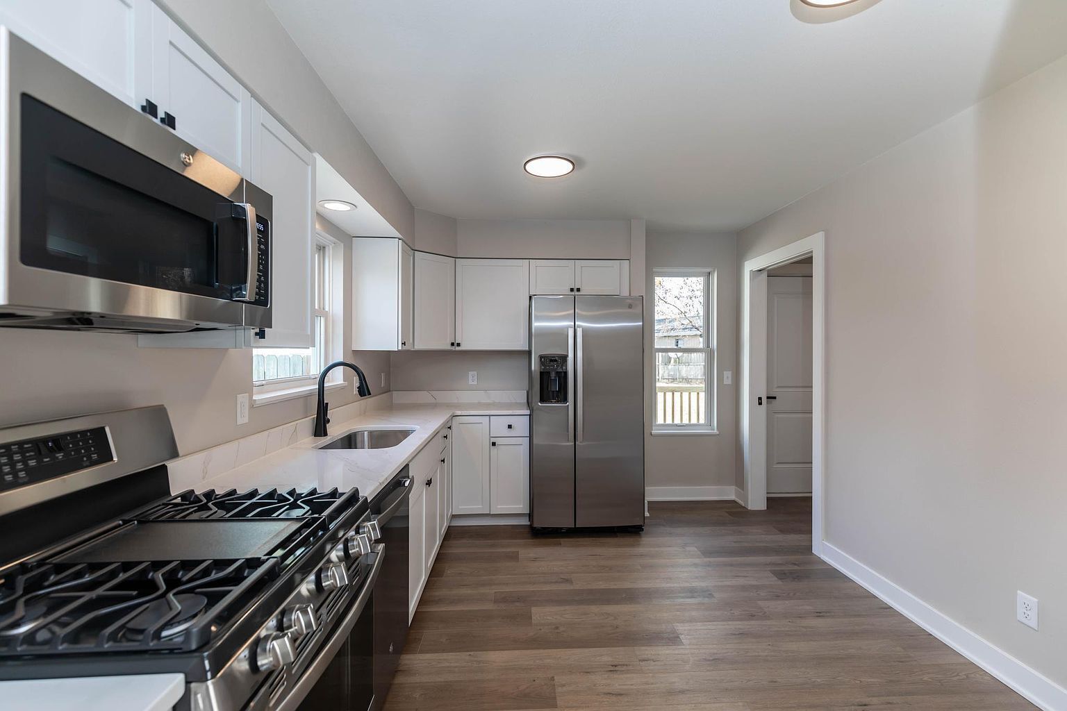 - Open-concept kitchen and dining room with table seating for four