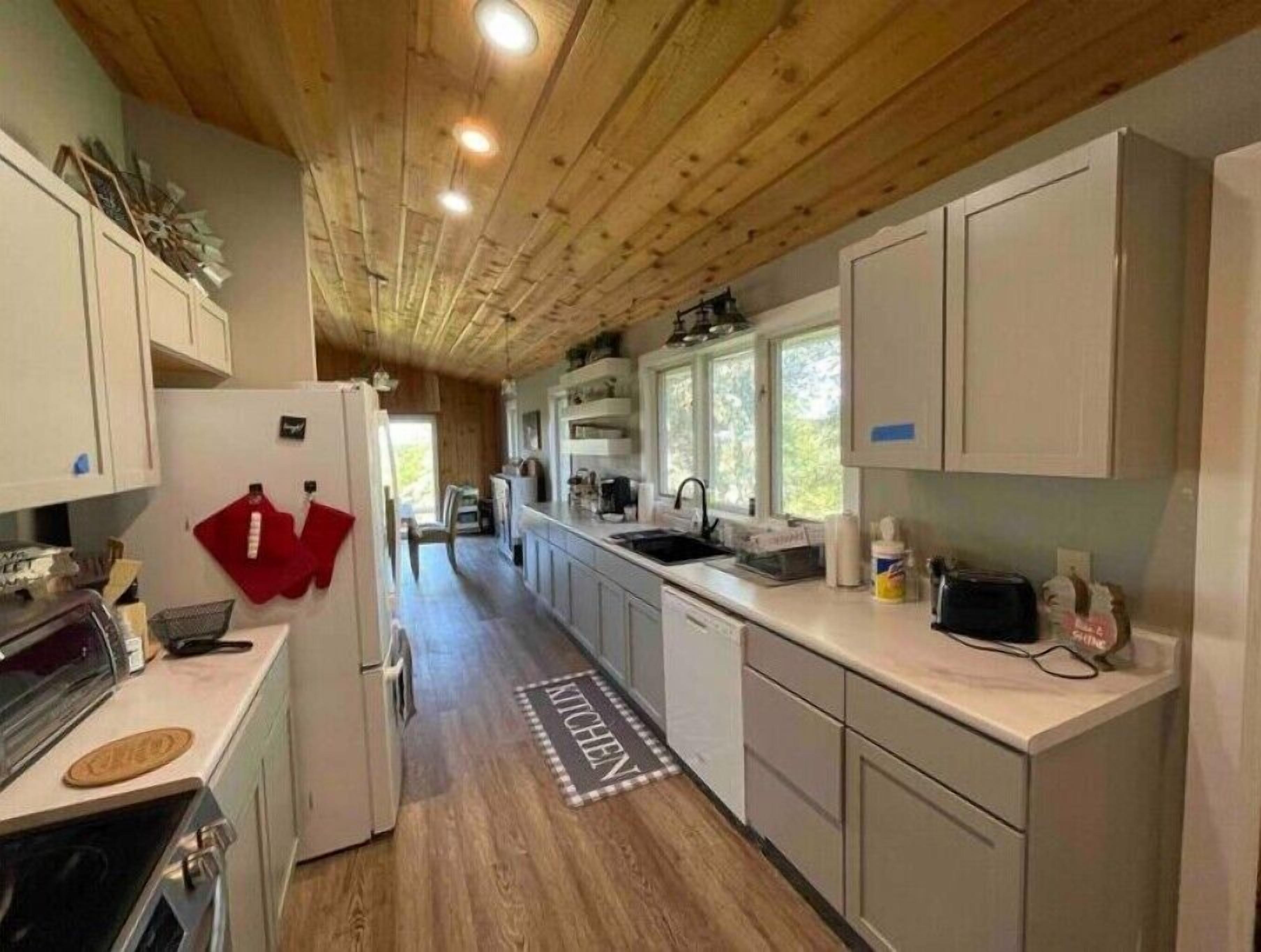 There’s an open concept living area with comfy seating, couch and massage chair on a fluffy rug in front of an electric fireplace. The kitchen is fully supplied for cooking should you want to cook, and there’s a kitchen table and 4 chairs for dining. The bathroom has a walk in shower, supplied with soaps and shampoos, All towels and linens provided. The comfortable bedroom has a brand new king sized bed, closet, with robes provided. There’s a washer and dryer, and beach towels provided for use at the hot tub. The best part is the deck! It adds another whole living space surrounded by nature, but if you want to watch tv you can do that too. There’s comfortable seating in a two person glider or rocking chairs. There’s a hot tub, propane heater in season, and ceiling fan. Watch tv from the hot tub, or simply soak in the sounds of the surrounding countryside.