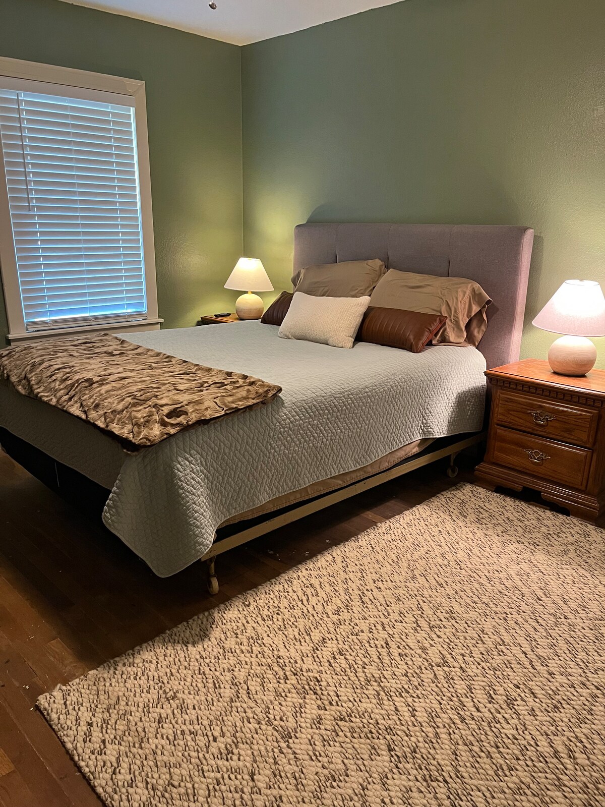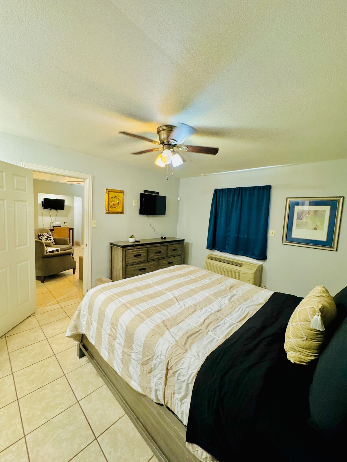 -- Comfortable bed acquired with the working person in mind. All linens, blackout curtains, portable fan, & everything a working professional would need to get a good night's rest. Bedroom includes a 40" Roku smart TV, so bring your streaming passwords so you can Netflix and chill