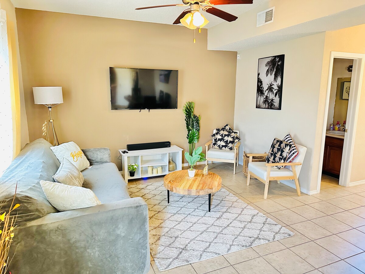 Newly renovated apartment located in Central El Paso near Ft. Bliss with easy access to Patriot Freeway and I-10. This peaceful 1 bedroom 1 bathroom apartment features amenities such as smart TVs in both the living room and bedroom, queen size bed, free WiFi, refrigerated air, work desk and a fully furnished kitchen for all your cooking and coffee needs.