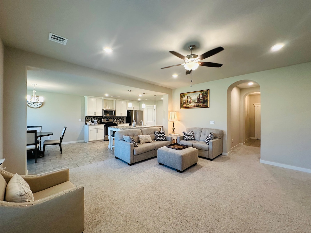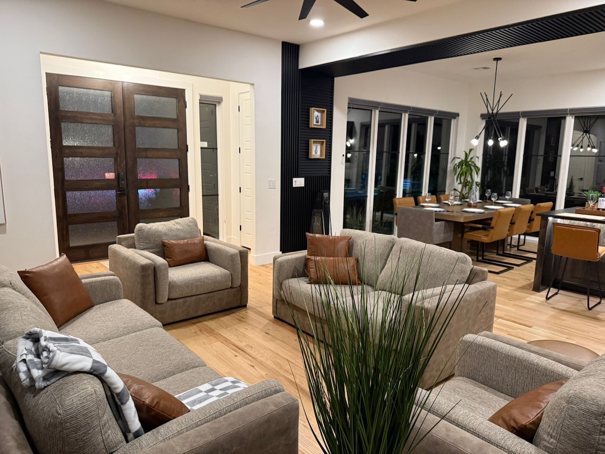 Open concept living room with leather sofas and a 65 in TV. The home features an open floor plan and the large kitchen counter that offers ample space for meal prep or casual dining. Walkable neighborhood with a park and conveniently close to shops and dining.