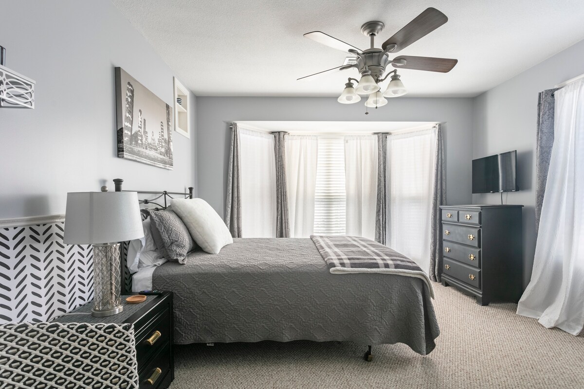 Each of the three bedrooms is thoughtfully furnished, with the larger rooms offering plenty of storage and cozy spaces to unwind. The bathroom features a full tub/shower and all the necessary toiletries to make your stay feel like home.