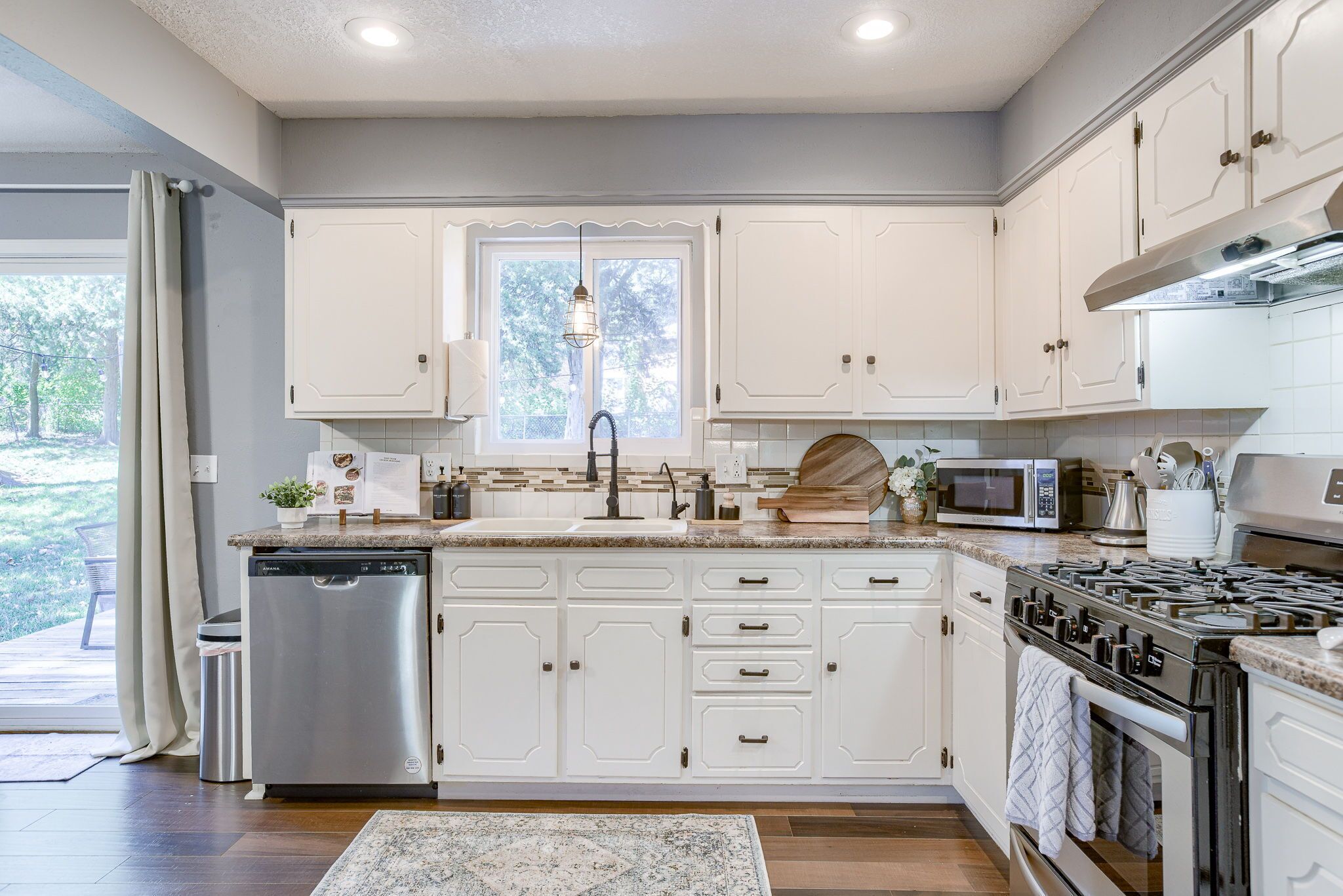 Stylish home near Blue Springs Lake, Lake Jacomo, and Lake Tapawingo (all within 5 miles). Features granite countertops, brand-new LVT floors, and a work desk in the master bedroom. Three comfortable bedrooms: 1 king, 2 queens. Open kitchen, high-speed Wi-Fi, laundry, and smart lock. Patio with grill and seating. Close to shopping, dining, and Cable Dahmer Arena (7 minutes). Centrally located to explore Kansas City. Two driveway parking spots in front.