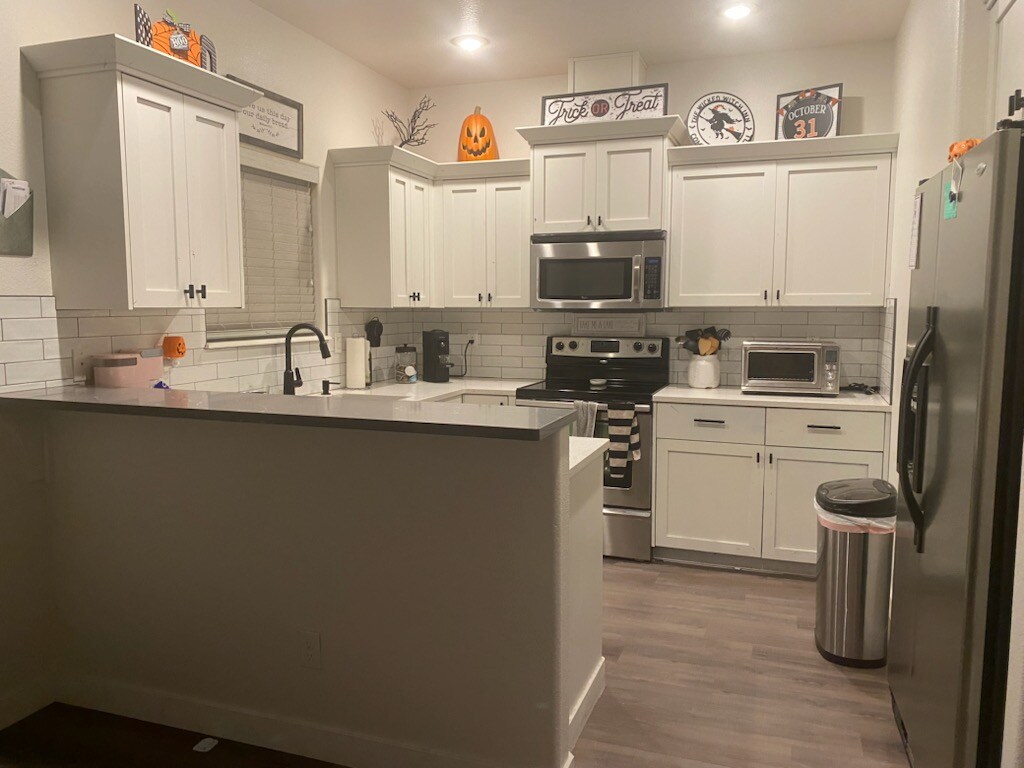 - Refrigerator, stove/oven, countertop dishwasher, microwave