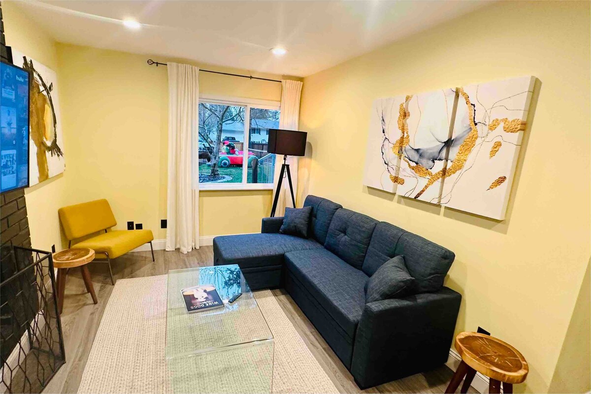 A modern fully stocked Kitchen, spacious living room, Smart TV, WiFi, books, and board games.