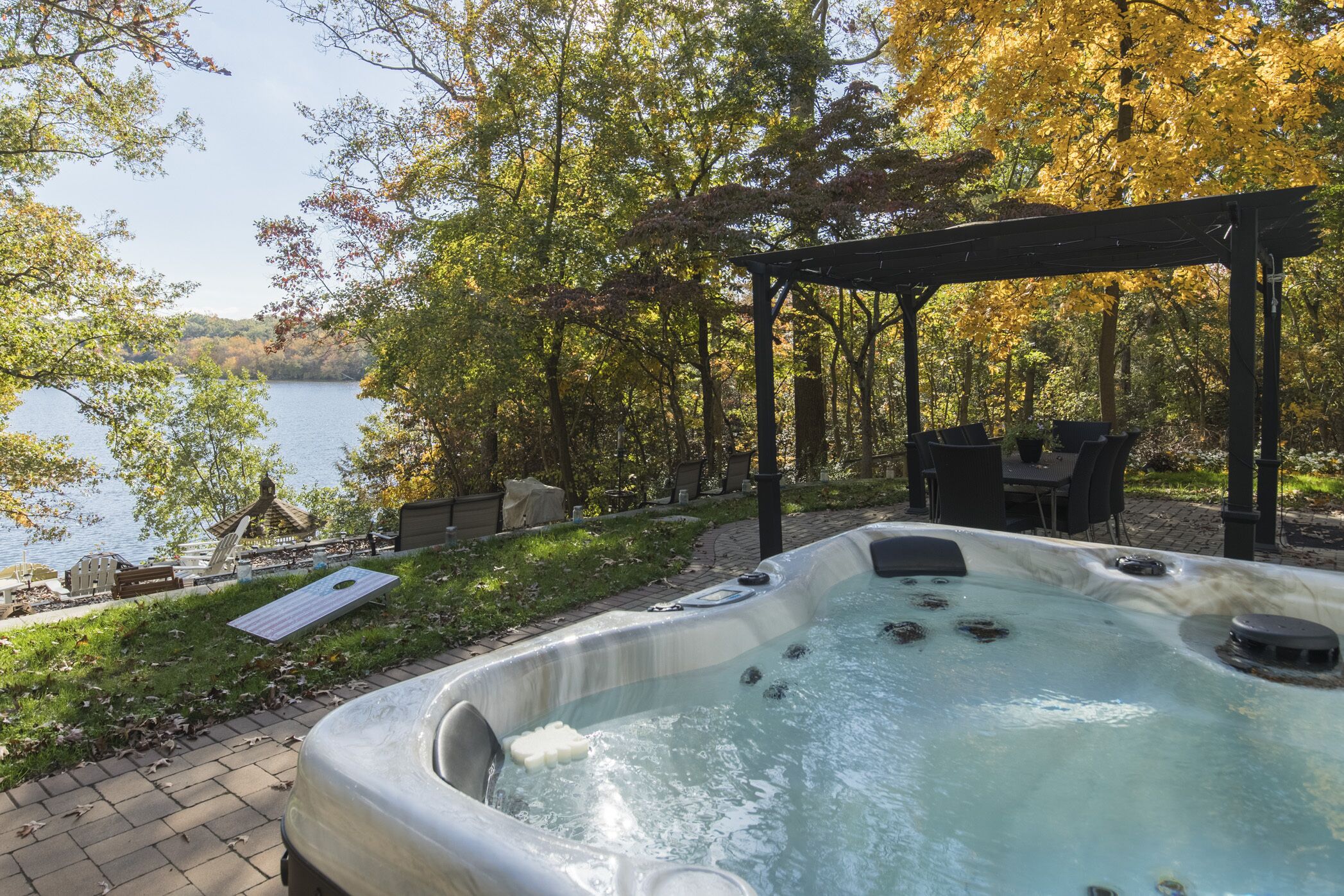 Watch swans glide across the lake and spot bald eagles, wild turkeys, turtles, frogs, and geese from your own backyard. This one-of-a-kind retreat features a private dock with two kayaks, two cozy fire pits, and a charming (capped) wishing well. Enjoy the in-ground pool (open May–Sept 23) and a 6-person hot tub with lake views (open Sept 23–May).