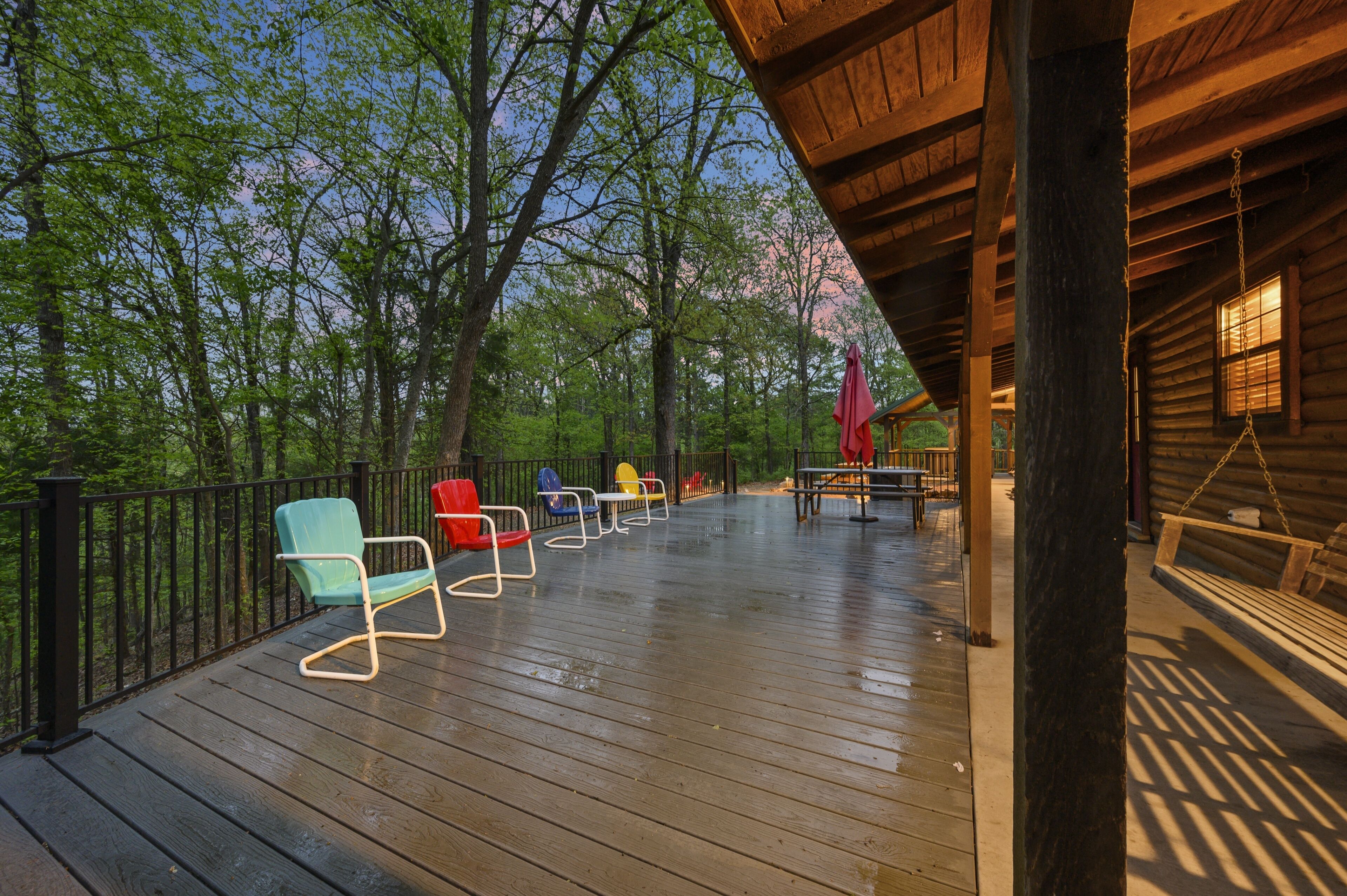 - "Lots of indoor and outdoor seating. Big back porch with the hot tub, picnic table and 2 seating areas on the back porch. Front porch swing. Loved the separate suite to split our large group of 7. Two kitchens could be very useful for some groups. Great fire circle and 7 Adirondack chairs. 7 towels for the hot tub. Also liked the washer and dryer. Location close to Beaver’s Bend State Park and Hochatown" - "Awesome. Red awning needs less communication prior to the visit!!"