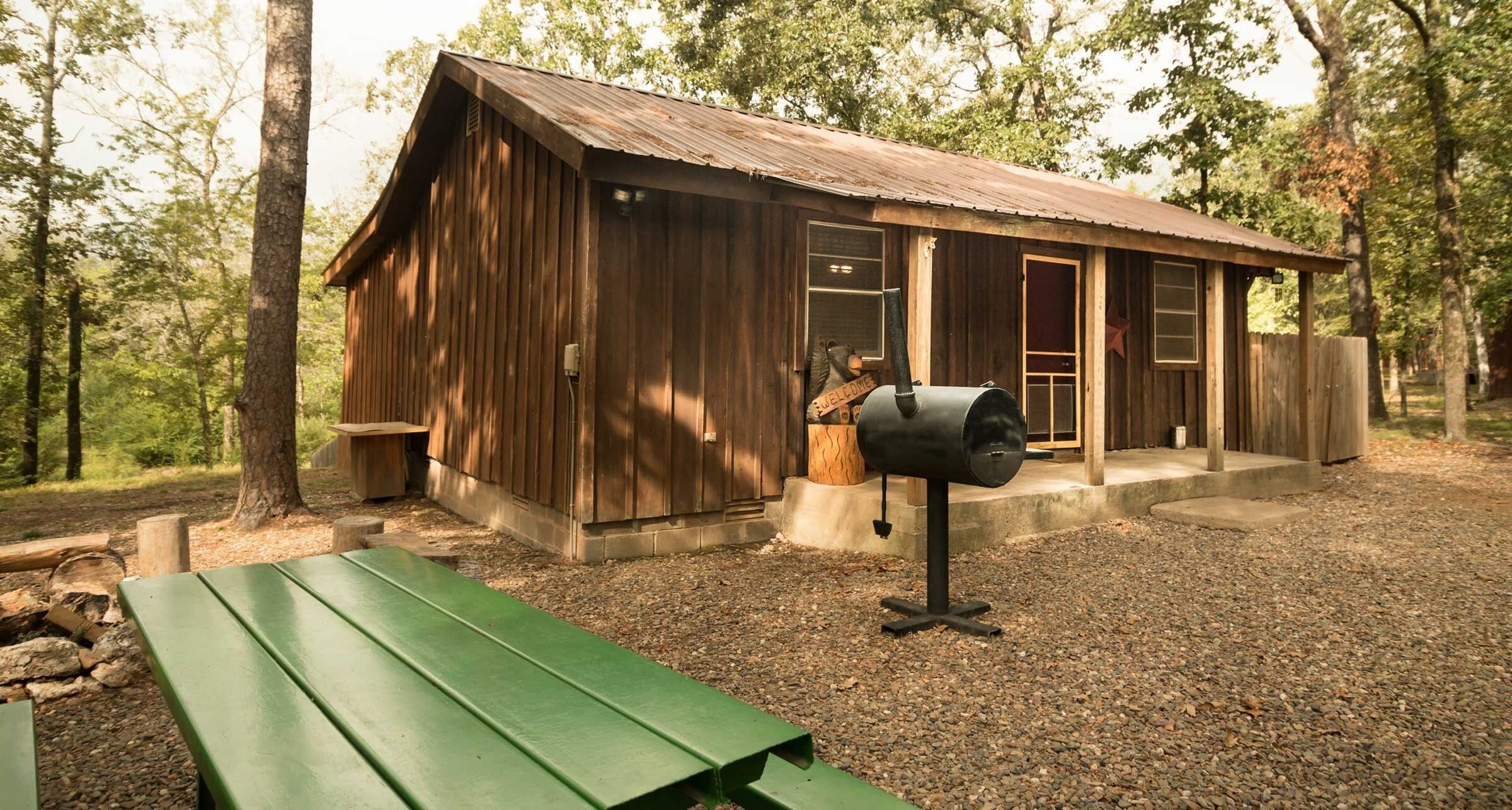 Green Mountain 1 BR/Sleeps 4/1 Inflatable Mattress/1 Bath/ Pet Friendly (25 lb. max). Come, stay, and view the starry skies in our “Green Mountain” cabin, which sits on a corner lot high in the hills in Timber Creek Trails, adjacent to forest company timberlands. Minutes from Broken Bow Lake and Beaver’s Bend State Park. This Broken Bow cabin feature’s a covered deck so you can enjoy your favorite beverage while watching the sunset and the wildlife. Pet friendly • NO SMOKING