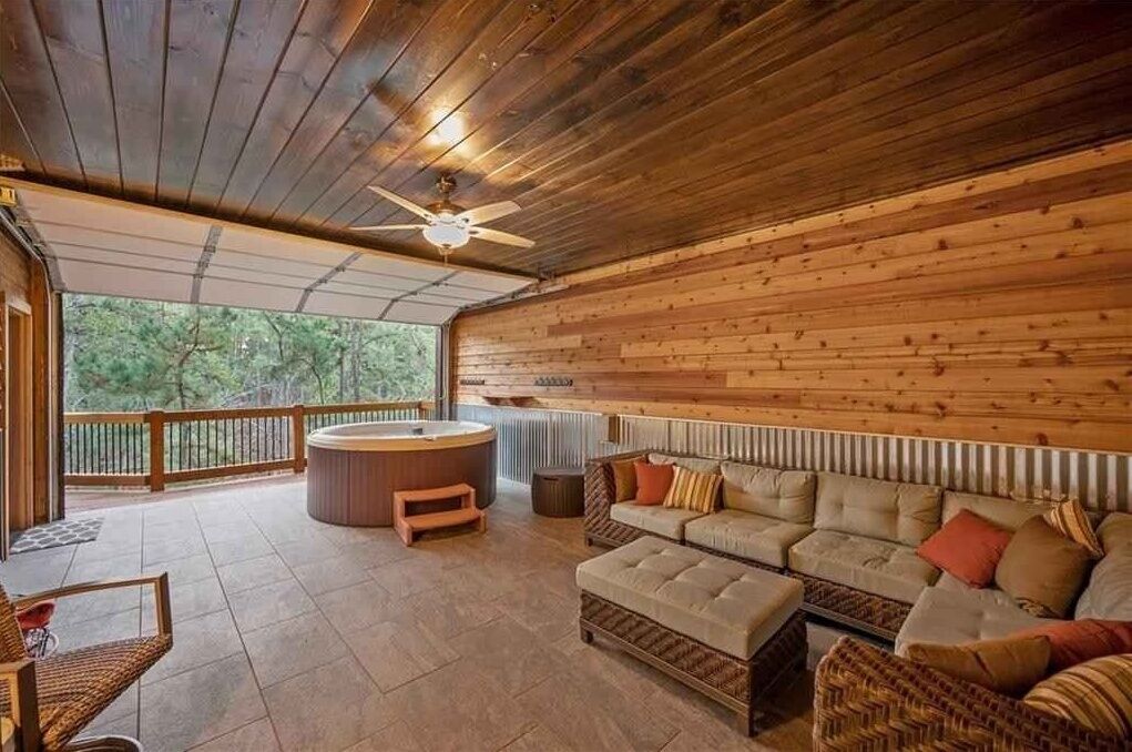 Step outside to enjoy the tranquil surroundings from the covered porch, or unwind in the private hot tub after a day of exploration. The cabin’s fully equipped kitchen and cozy living space ensure all the comforts of home amidst the beauty of nature.