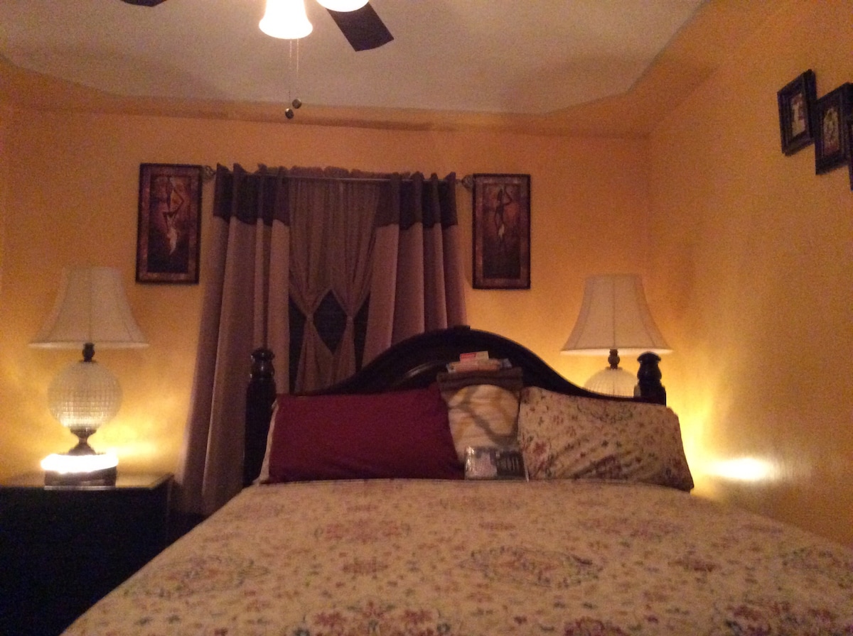 This comfortable room is part of a specious two level apartment where the number of guests will never be more than 5. The shared bathroom has a fan and a window for fresh air circulation, and there's a half bath on the first floor. The apartment has front and back porches for guests' enjoyment. The room has a queen size bed, a closet, a TV set, a drawer, a night stand , and an AC unit.