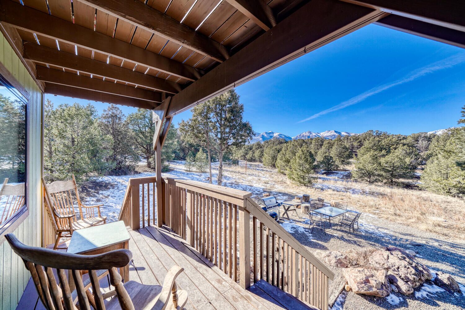 This mountain cabin has views of the Collegiate peaks and Sangre de Cristo Mountain ranges from the lower and upper decks of the home.