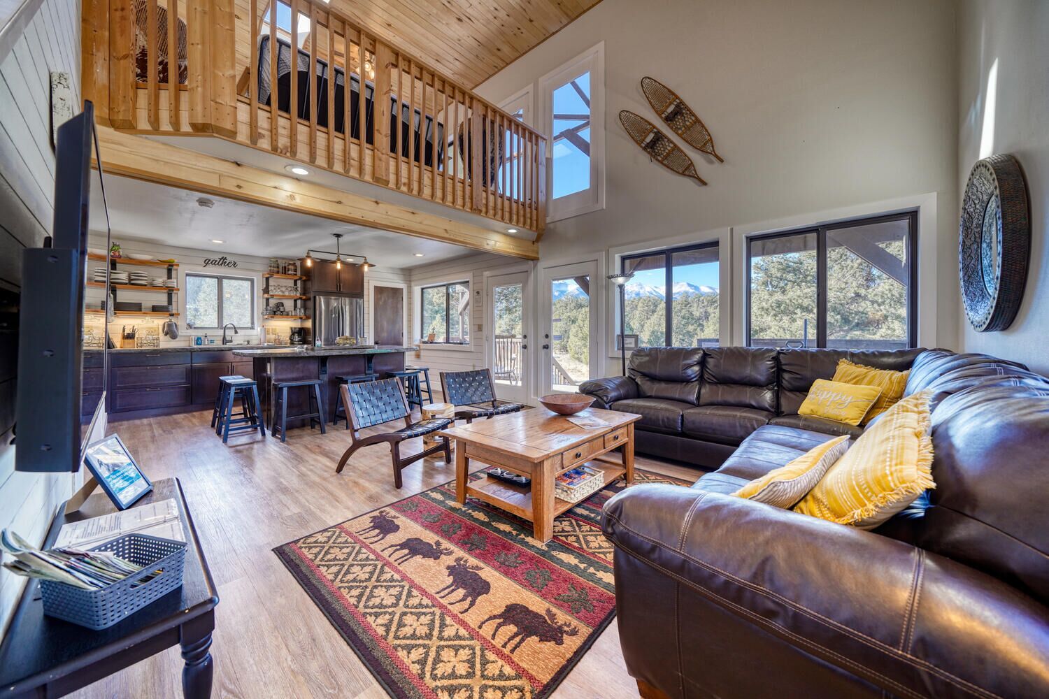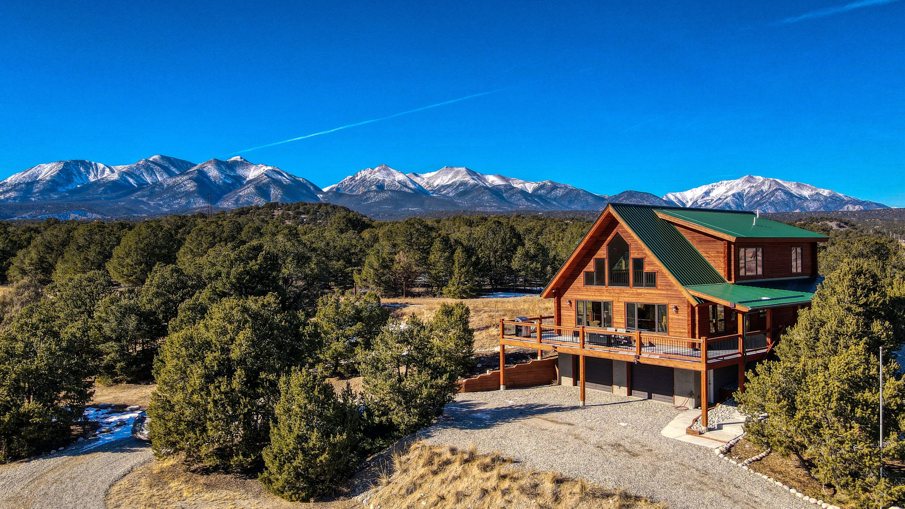 This spacious log home has got views of two of Colorado‘s best mountain ranges, the Collegiate Peaks in the Sangre De Cristo mountain range. You’ll wake up in the morning, look out your window, and be able to see both!