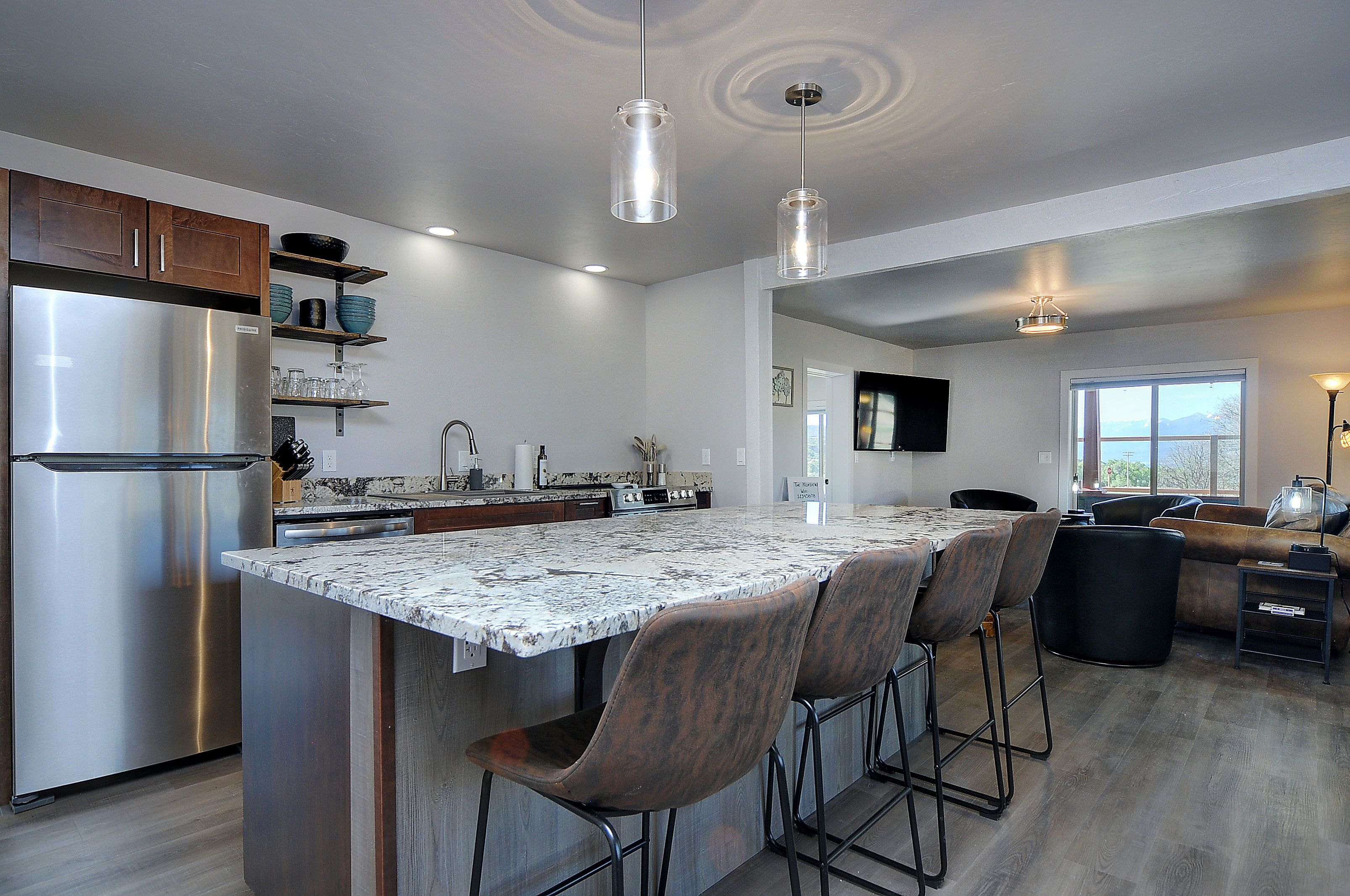 With three bedrooms, two bathrooms, a large living room and kitchen downstairs and a large loft upstairs, there is plenty of room for everyone to enjoy meals and family time or curl up in a quiet spot to read or enjoy the view of the mountains.