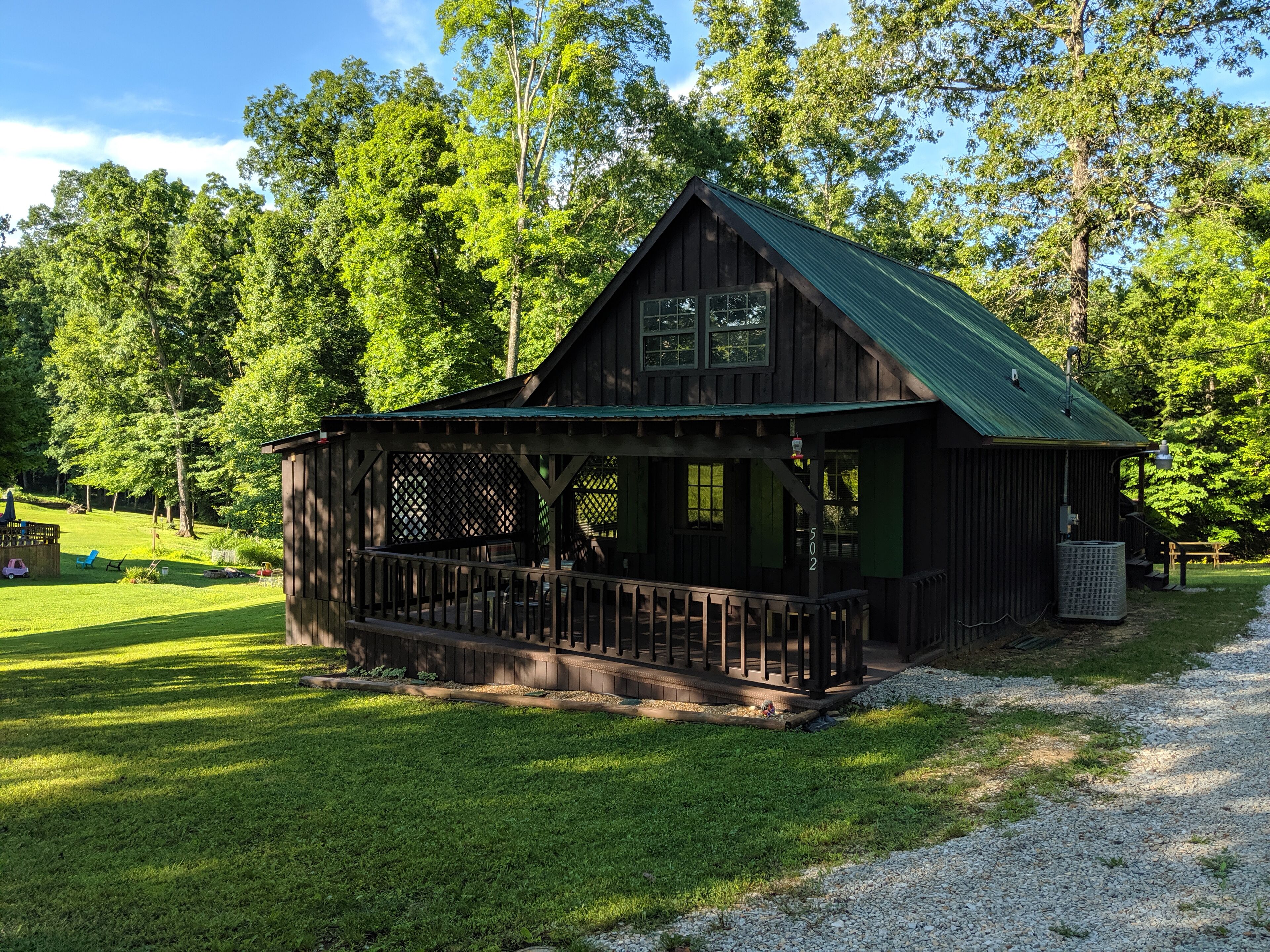 Semi-secluded with a huge yard with bunk house, fairy garden, campfire, saddle swings, creek fun, etc.