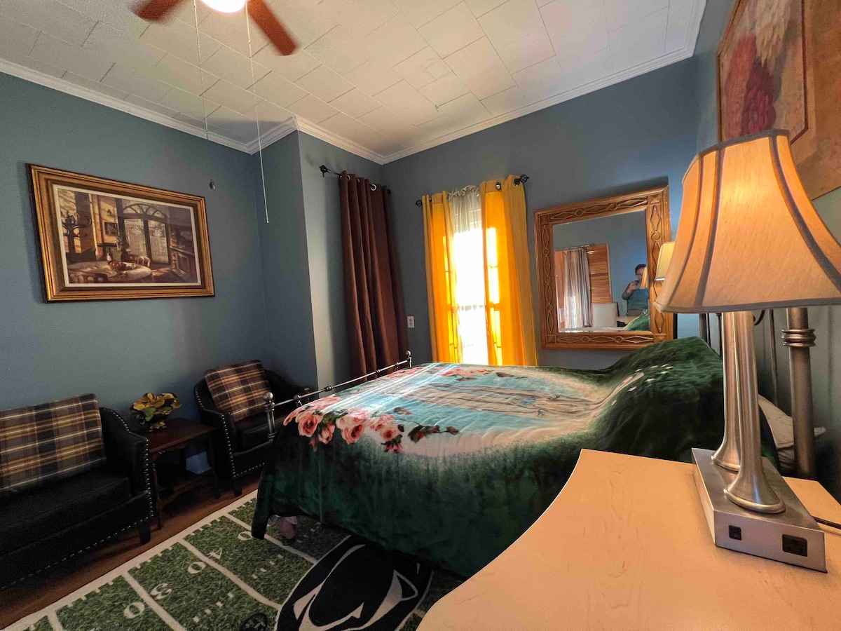 BEFORE booking, please read! Studio space with a convertible couch that lays back into a full size (people either really enjoy this or not at all, there’s no in between 🤣). Pillow top included for extra comfort. Full bathroom with original claw foot tub. Monitor to connect devices to. Coffee maker, microwave, small fridge, and toaster oven. This space is above a garage so there is a stairwell. PLEASE NOTE: our home is over 100 years old and with plaster walls, so wi-fi is spotty!