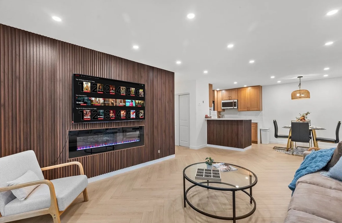 The living room has a cozy fireplace and furnished with a Smart TV.
