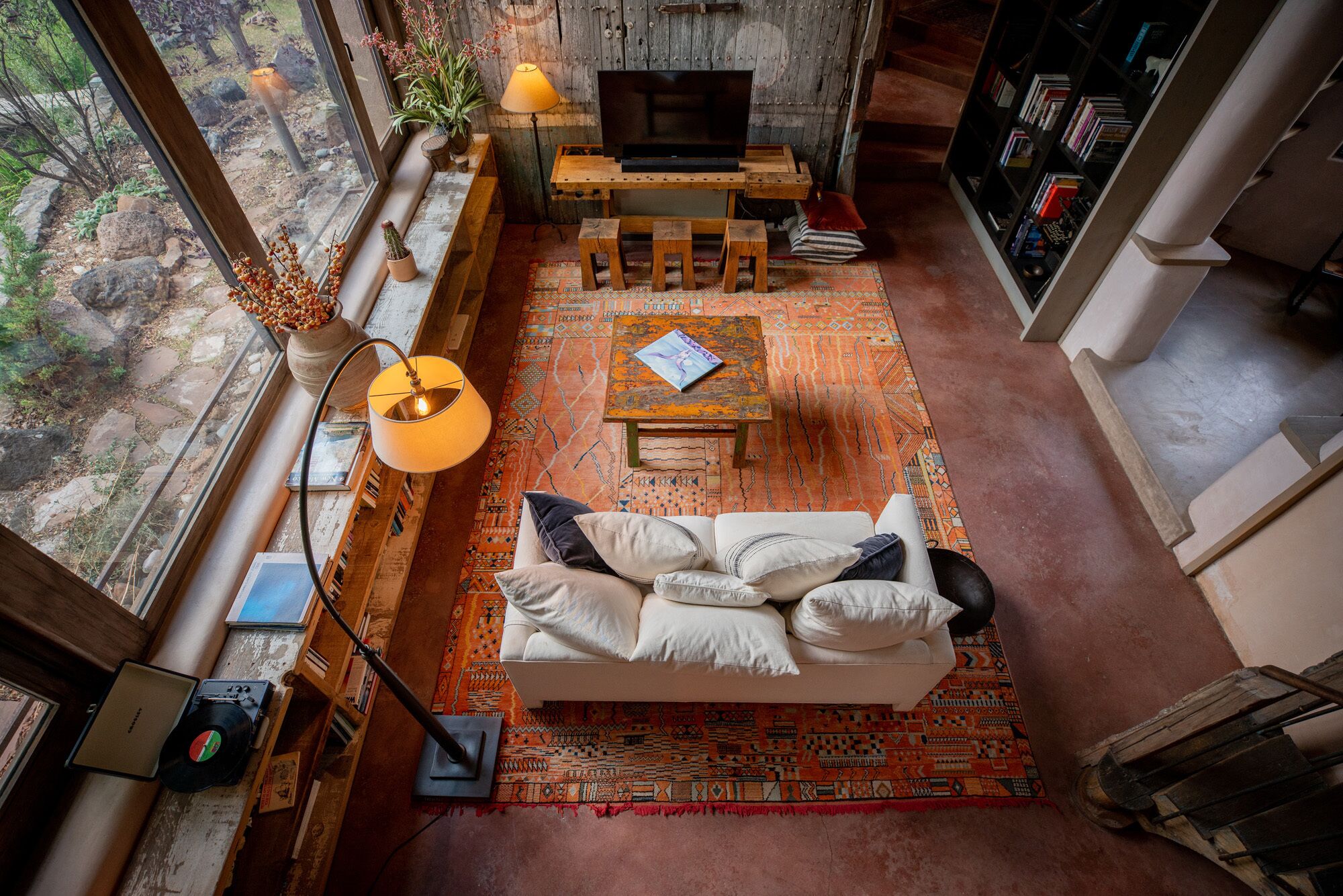 Light-filled, the downstairs area hosts a living room with a fold-out couch, a dining area, a fully equipped kitchen, an elegant full bathroom, an office space, and a surrounding terrace. The upstairs area has a queen-size bed, an indoor reading nook, and a small outdoor reading balcony.