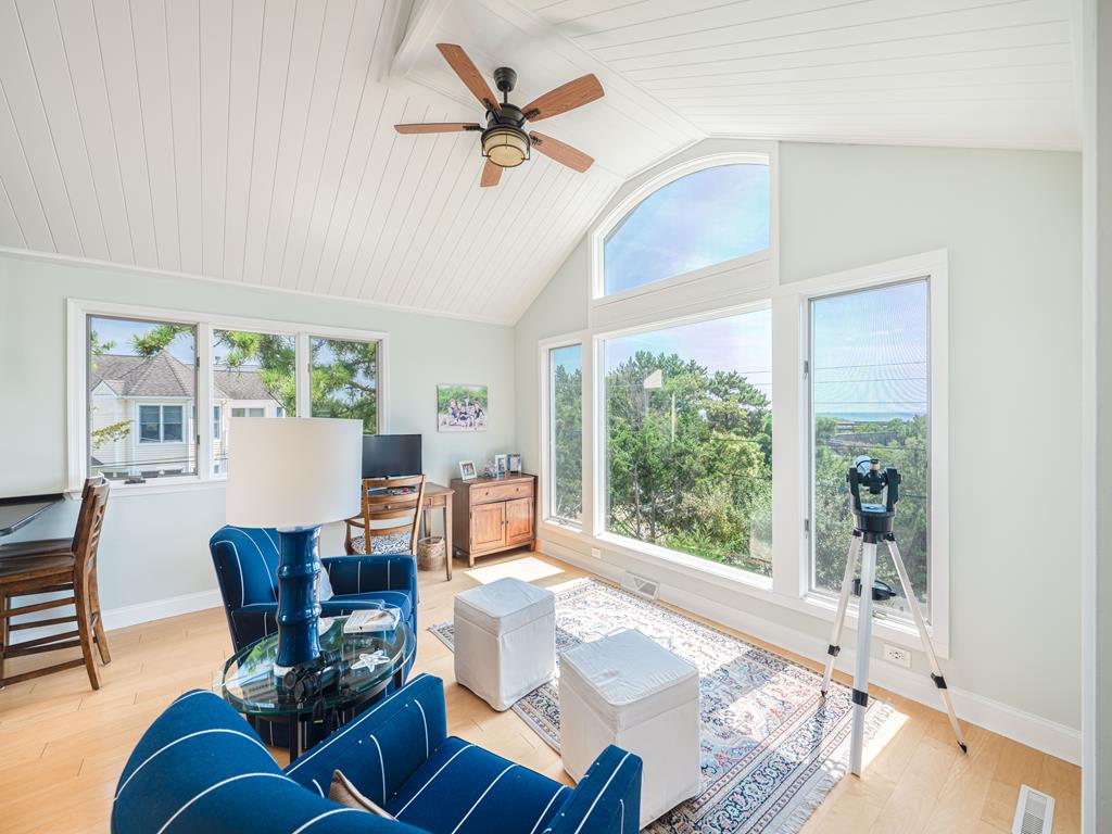 Ascend to the sunlit realm of the top floor, where a spacious living area unfolds in a tapestry of plush furnishings, a state-of-the-art flat-screen TV poised above a decorative fireplace, and sofas that invite you to sink in and let go. Here, the home’s thoughtful upside-down design gifts you with panoramic views of the coastline, framed by windows that draw in the light and breezes from the ocean. Tucked away, a quaint loft offers a tranquil nook for reading or stargazing through the provided telescope, with a quaint powder room nearby for convenience.
