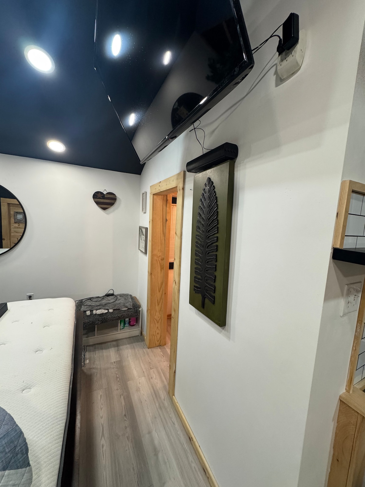 Two trundle beds; double over twin, private deck with stairs to the fire pit in the secluded yard.