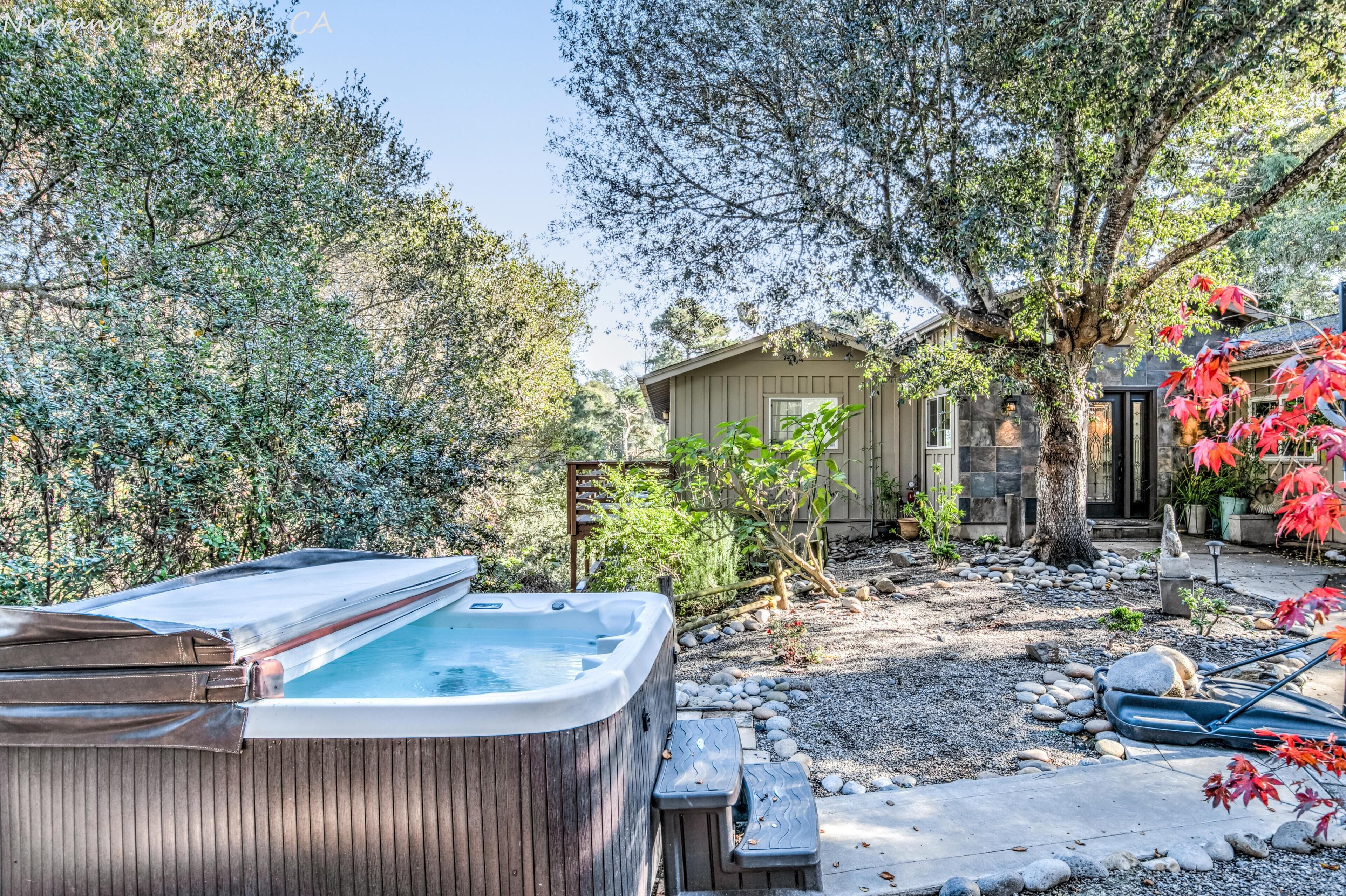 Gorgeous, newly remodeled Contemporary Big Sur-Style Guest House with private Hot Tub, 2 decks, gas fire table and chat set. It feels both open and private with a bank of windows from end to end that open up to views of Carmel Valley, Carmel River Beach and Point Lobos. After gently descending 22 well-lit and landscaped redwood stairs to the lower level, you will enter a beautiful, private landscaped yard with views overlooking a canopy of trees with virtually no direct view of other houses! This 930 sf ground floor Guest House has a large living room, large Master Bedroom that includes an office area with a copier/printer, a Master Closet with full-sized Washer/Dryer, and views of Point Lobos. You may never leave the bed! There is a Main House above it. Additional sound-proofing has been added both to the ceiling as well as new flooring in the Main house with commercial insulation which was added in December 2022. This newly renovated home is fresh, clean and uncluttered with an updated Big Sur lodge influence and New Everything!