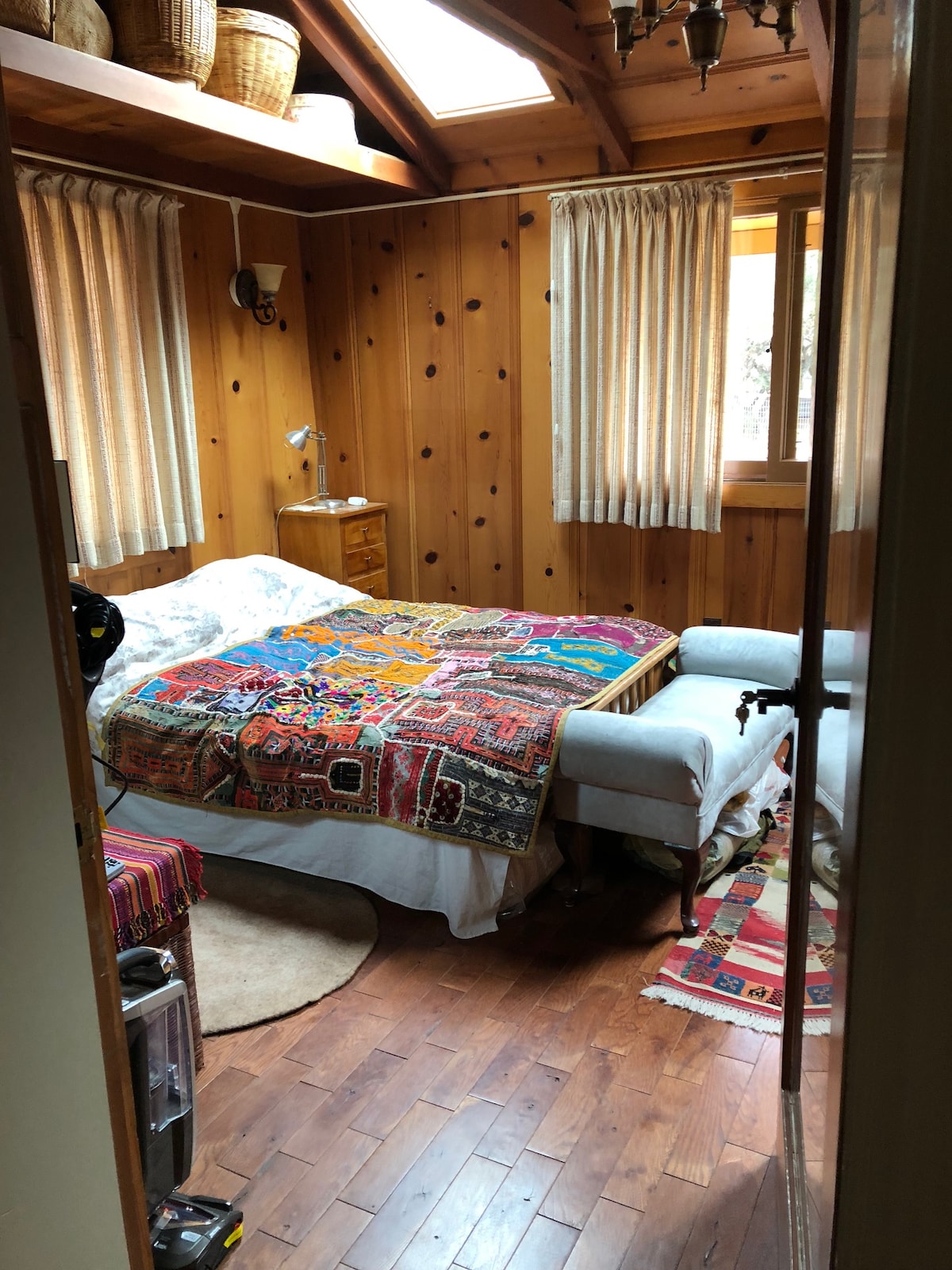 A wide staircase winds up to the deck with table and seating (smoking allowed outside, only) and the double doors to the apartment. The all redwood building has a peaked, open beam, tongue and groove ceiling with cathedral-shaped stained glass windows on each end and screened windows throughout.