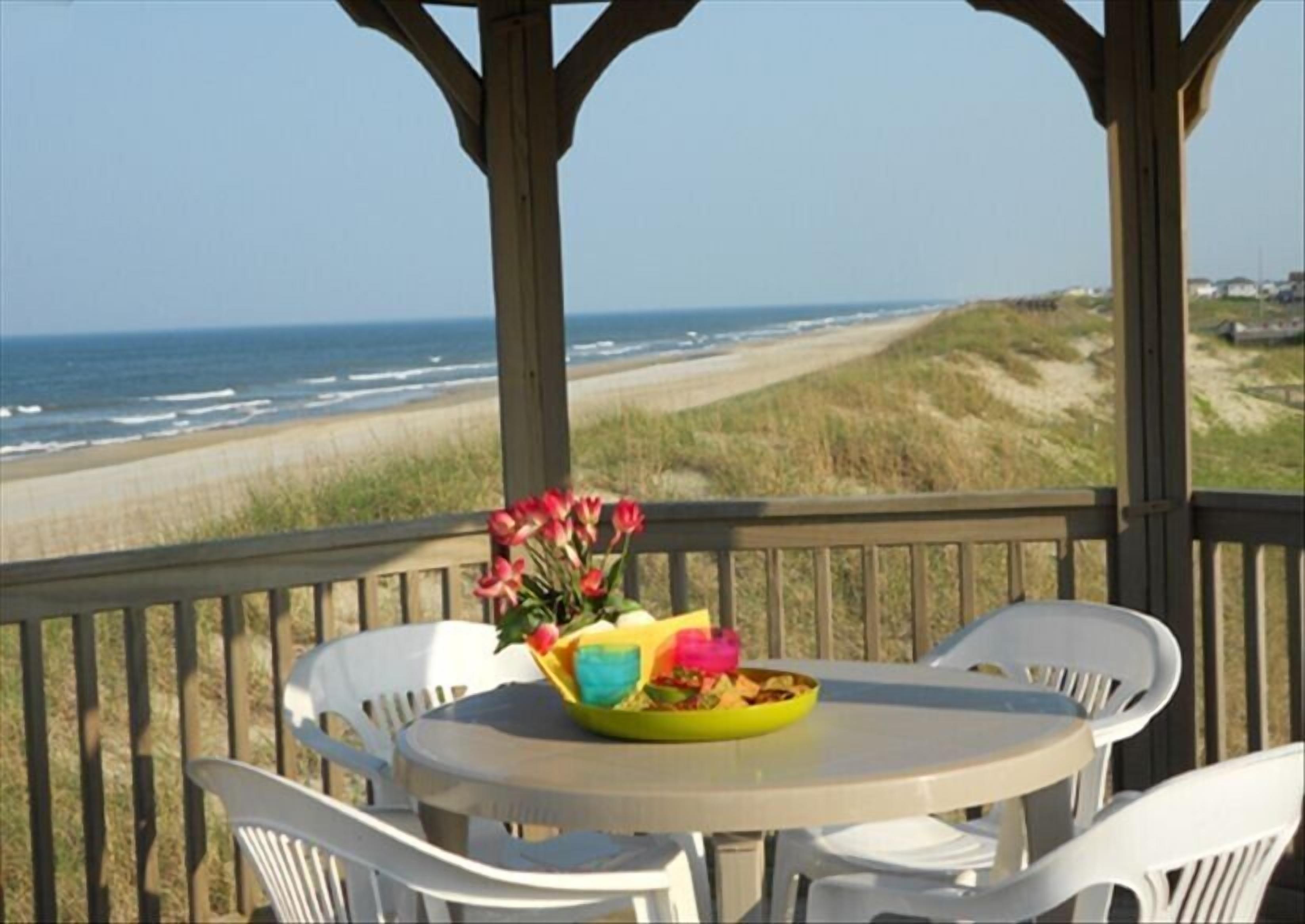 Awake to the wild mustangs having their morning fill of sea oats, so why not join them for breakfast in the gazebo? You can enjoy the glistening morning surf, and watch the ocean with its abundance of sea life frolicking in the morning lull. The views will be mesmerizing as you sip your morning coffee.