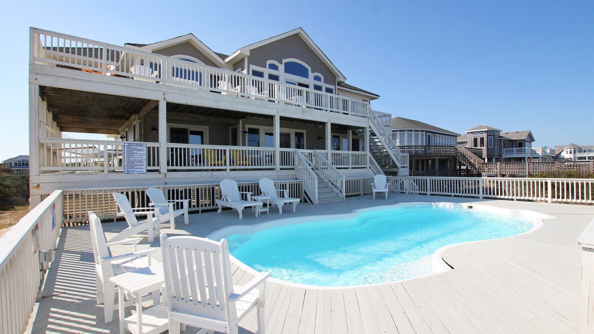 For more outdoor living, take your pick from the 5 decks - enjoy the ocean breeze while dining with the family on the main deck off the great room, watch the sun rise and the wild horses graze while sipping your coffee on one of the private master suite decks, or read a book on the covered deck overlooking the private pool below. The pool, hot tub, and game room (with pool and shuffleboard tables) offer the perfect way to wind down after a day on Carova’s pristine beaches. The home is a short walk to the beach, or you can take advantage of one of the greatest benefits of the 4-wheel drive beaches and load up your vehicle with everything the family will need for a day on the beach and drive right on the beach! This home-away-from-home offers countless opportunities for spreading out or relaxing together on your family vacation - a vacation that is sure to be a totally unique experience.