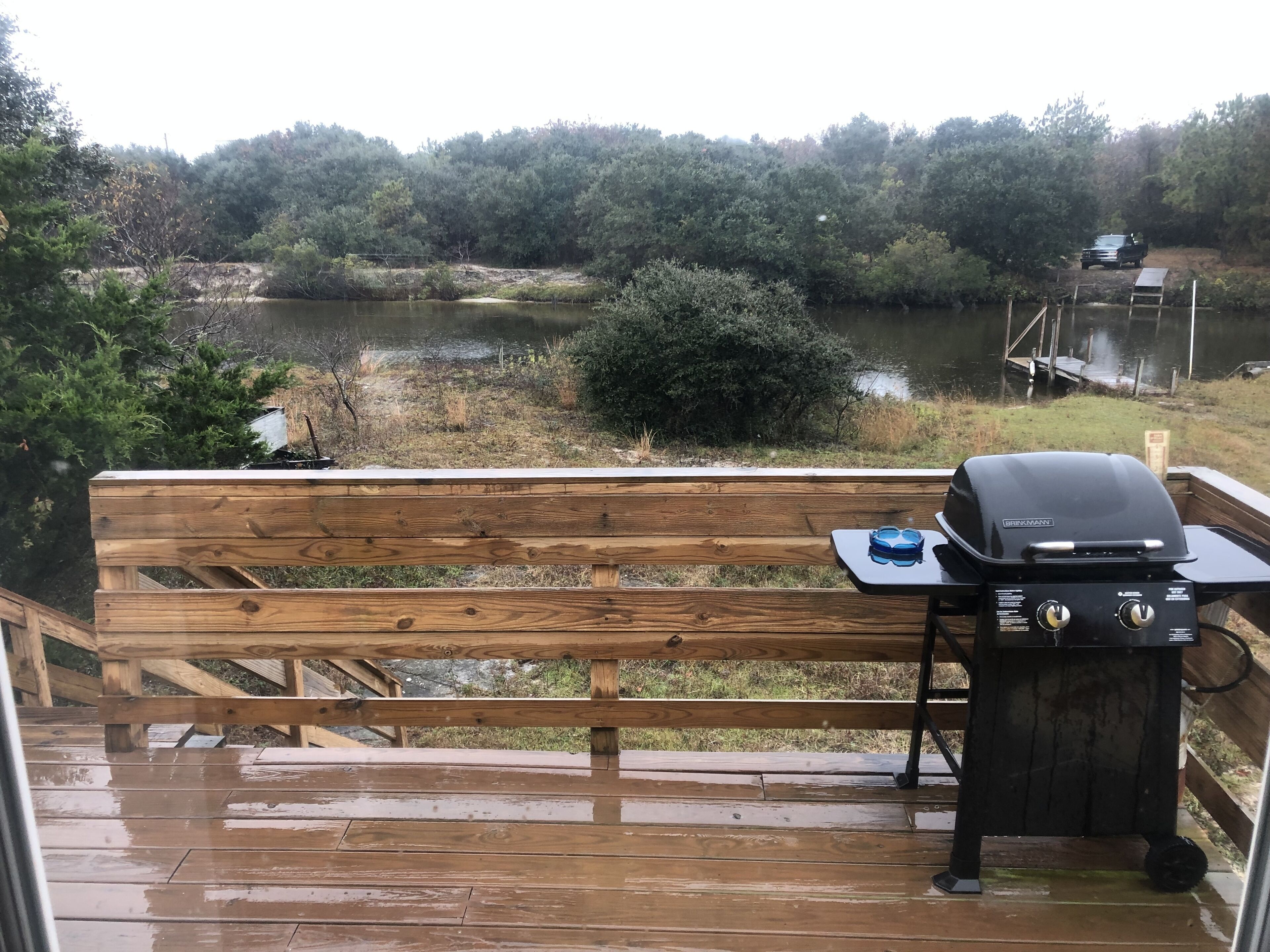 Large front deck with table and chairs, gas/charcoal grill and other deck chairs. There are plenty of beach chairs, boogie boards, 2 kayaks, corn hole boards, fishing poles, and umbrellas included.