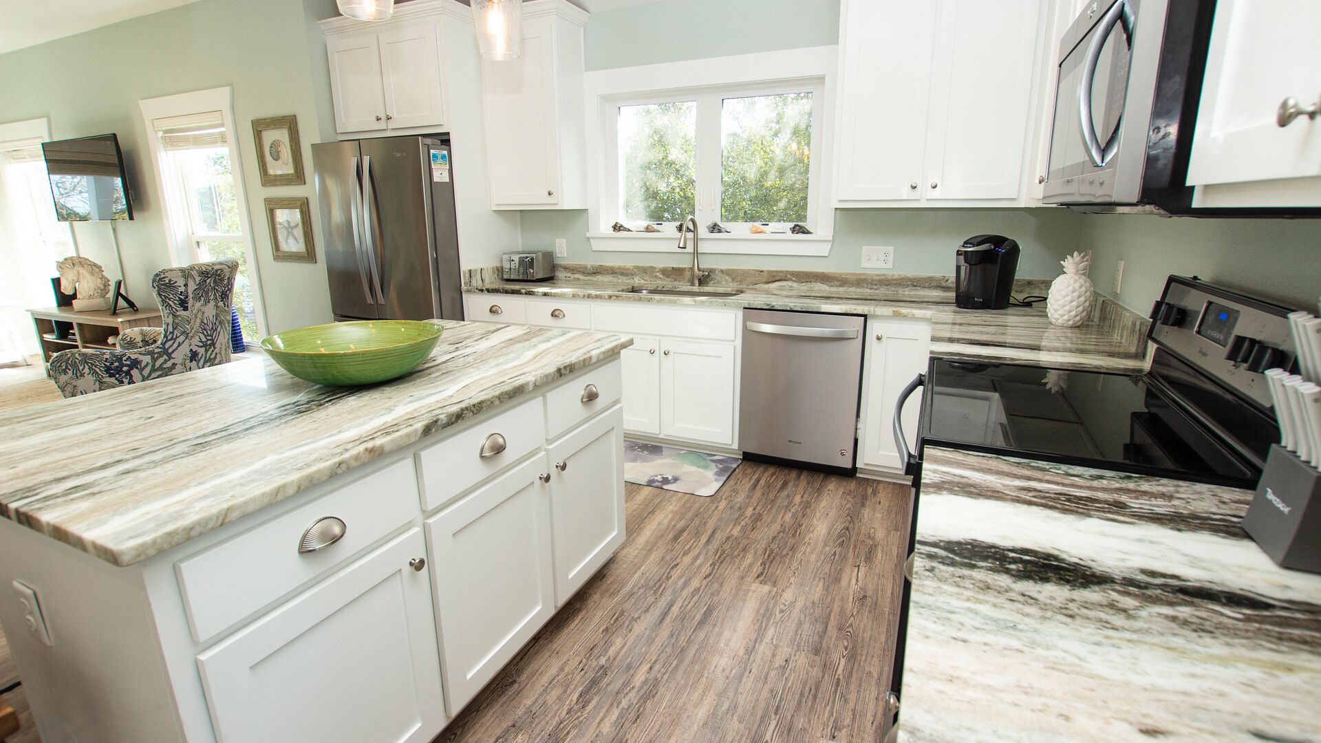 Relax after a long day of exploring, fishing, birdwatching, beach combing, swimming and surfing on comfortable leather sectional couch with 4 reclining seats and 55 inch TV or prepare a family feast in a kitchen that includes the newest Whirlpool black stainless steel appliances, granite countertops & open island seating area.