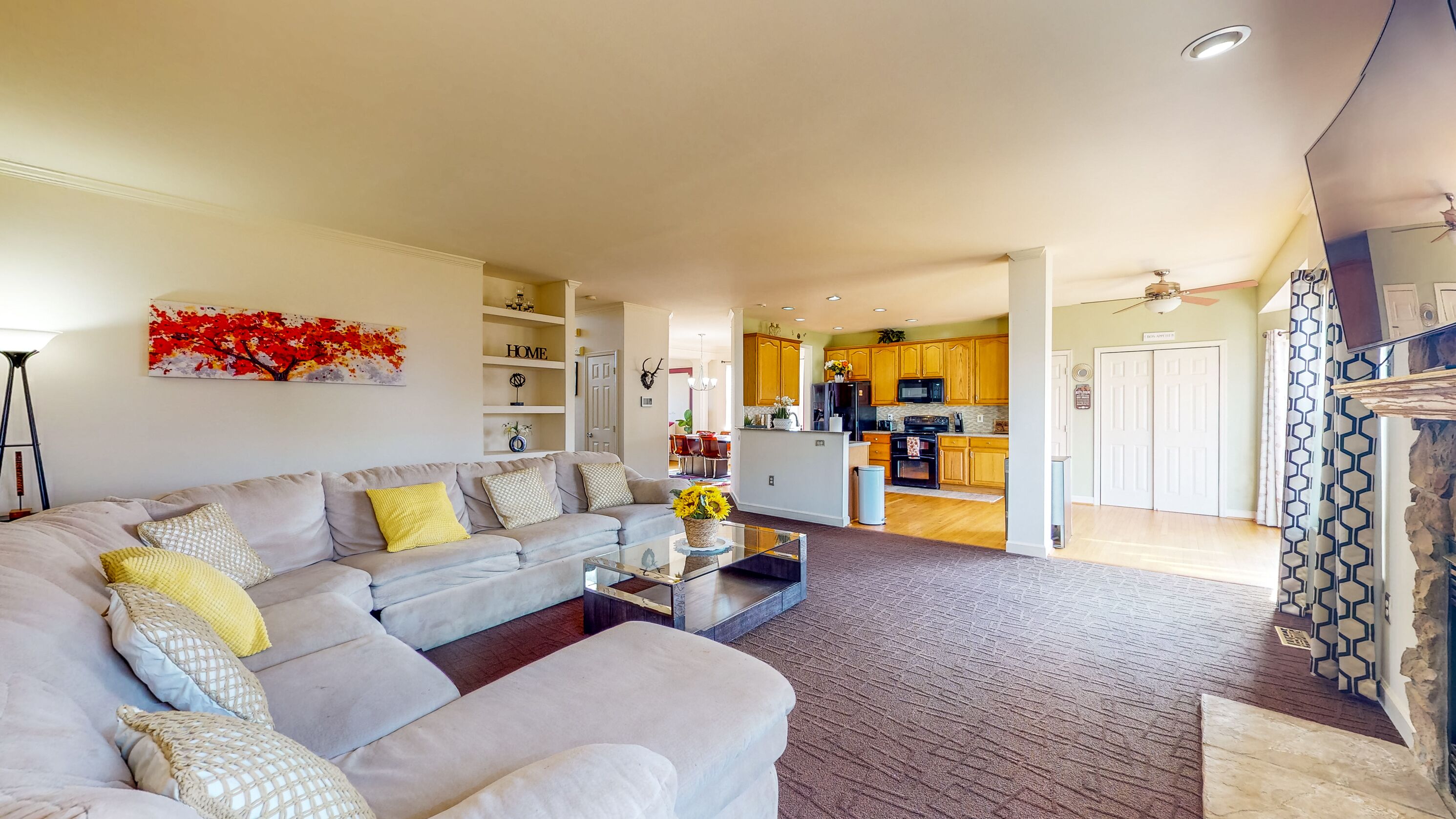 The main-floor living area offers family comfort anchored by a gas fireplace, a plush sectional, and a smart TV. The sunny front foyer comes furnished for morning coffee and conversation. Plan and prepare home-cooked meals in the well-appointed full kitchen equipped with all the major appliances, plus an additional mini fridge and dishwasher.