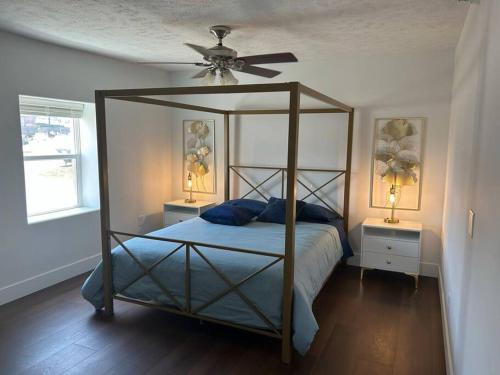 This house has a circular staircase to access the second floor, where the king bed is located. In addition, there is a twin bed with an additional trundle in main floor bedroom. In addition, the property has a boat ramp to access the lake.
