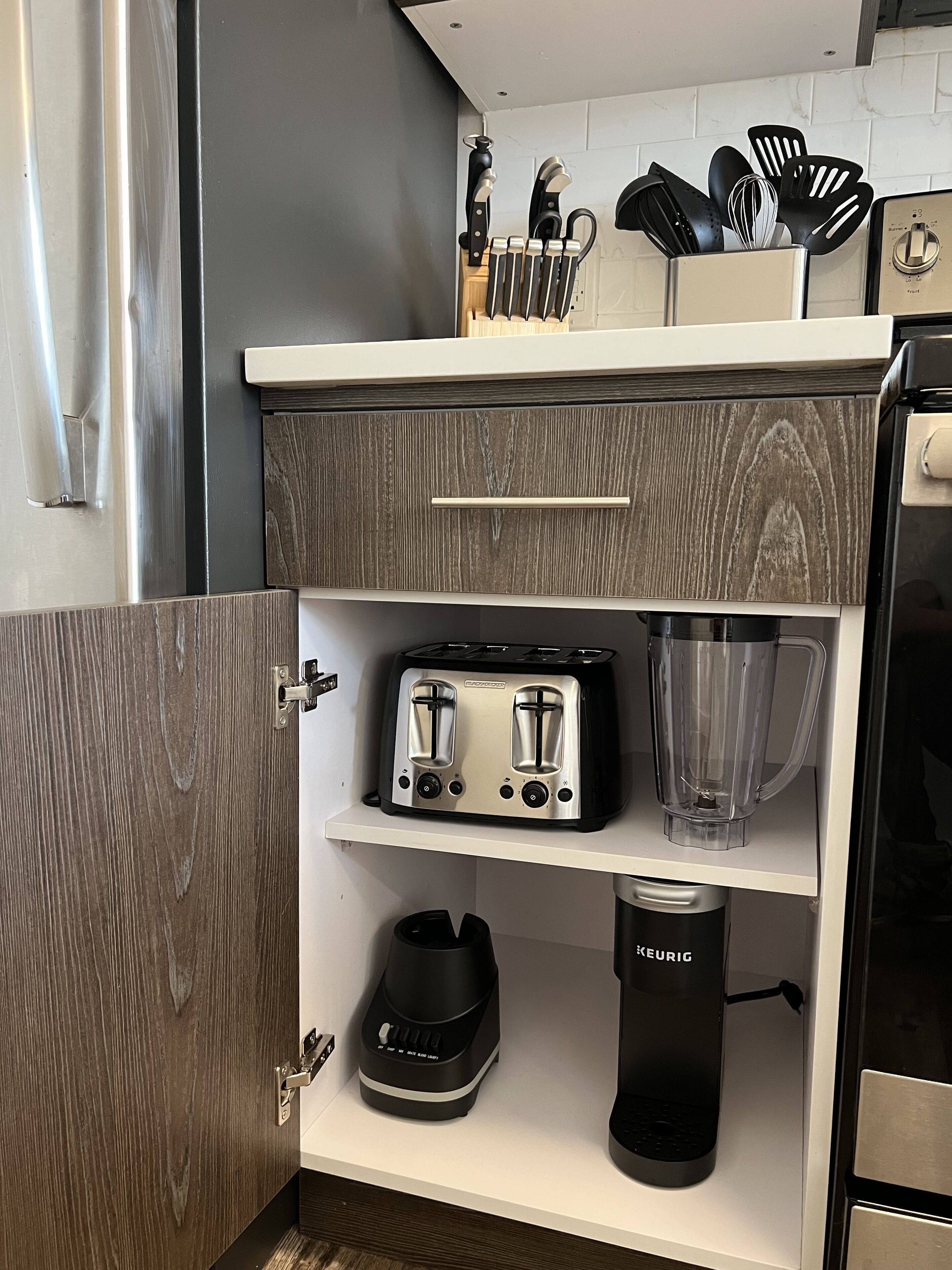 Includes a mini fridge, microwave, and coffee maker — perfect for storing drinks, heating up meals, or brewing your morning cup.