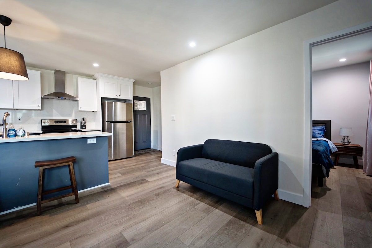 Unwind in our modern guesthouse featuring a queen bed, high ceilings, a fully equipped kitchen with a dishwasher, and in-unit washer/dryer. Stream content on a 65" 4K TV with Prime & Netflix and stay connected with high-speed internet and a work desk. Start your day with coffee in the fenced backyard—a city oasis filled with birdsong.