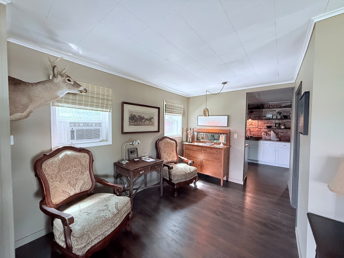 The bright living area offers the sights and sounds of the lake, as well as a TV with DVD library and Roku, and books and games for entertainment. A/C is a window unit in the living area, but the space can be quite comfortable just opening the windows and letting in the breeze.