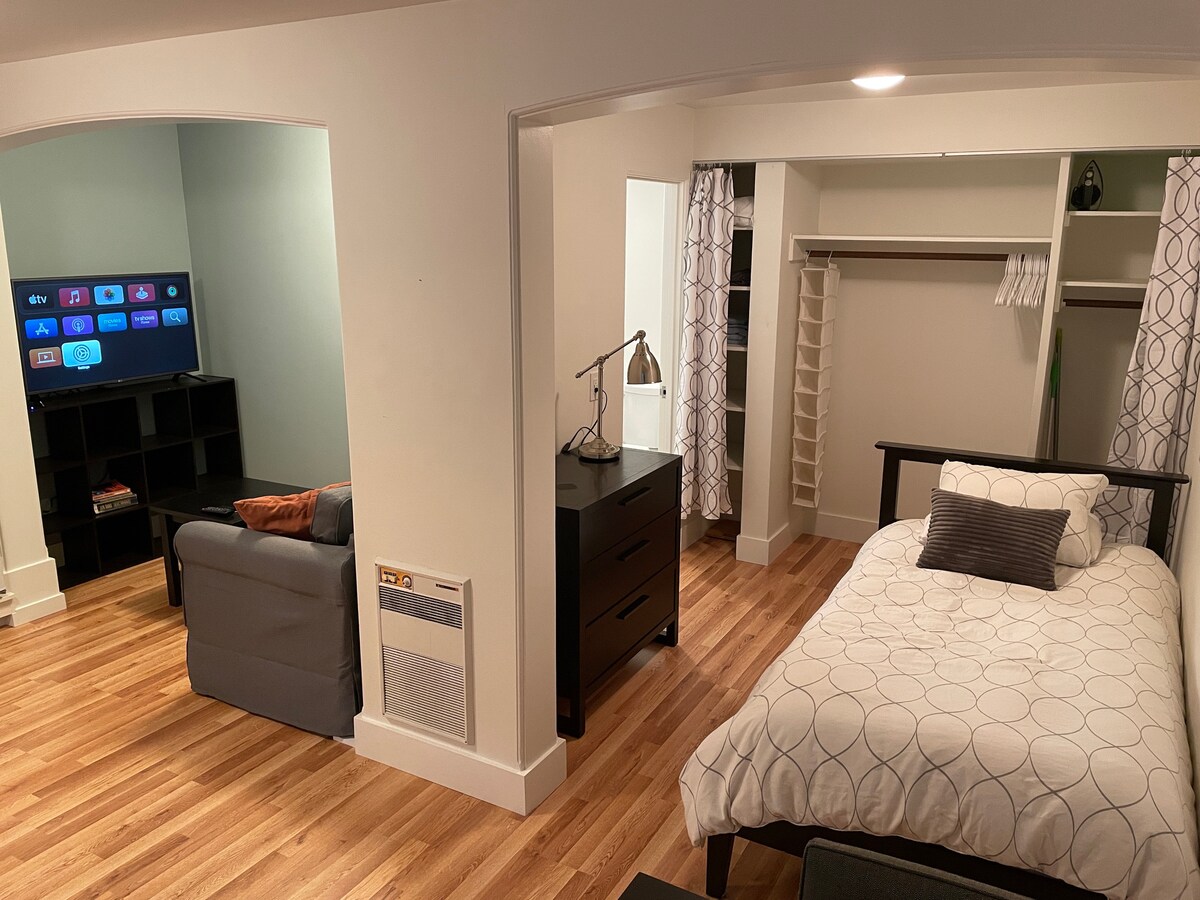 The artistically designed space is ideal for 1-3 people. Although it is not large, it feels comfortably open and airy. The bedroom has a lockable sliding door providing privacy if need be, with a queen bed. The chandeliered sunken living space includes a dining or work table, a single daybed, a couch, chairs, shelving and a TV and WiFi. The large tiled shower is separated from the half bath down the hall. A wall of closets provides plenty of space for belongings along the entry hallway.