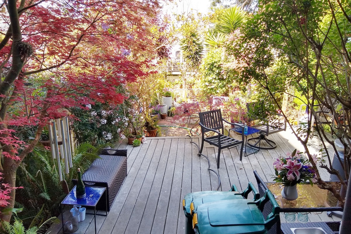 Long-term stays only. Your own bathroom and private room with french doors opening to a gorgeous deck & garden, in a quiet beautiful remodeled Victorian home in Noe Valley, one of the best neighborhoods in San Francisco, walking distance to restaurants, shops and public transportation. Well-equipped, remodeled kitchen, livingroom, and dining room (shared). Ideal for long-term professionals who love living in the middle of city and yet enjoy the peaceful lush green and peacefulness of a home.