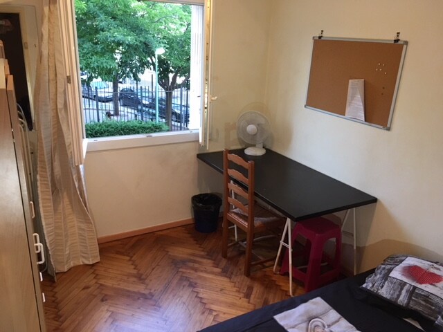 It is equipped with a wooden storage cabinet with a wardrobe side, a desk (140 x 80), a Clic-clac (190 x 140), two folding chairs, a wooden chair and the equipment of its own utensils kit (a pillow, a large duvet the size of the Clic-clac, a mattress topper, a mattress cover, 2 flat plates, 2 soup plates, 2 dessert plates, 2 bowls, 2 knives, 2 forks, 2 tablespoons, 2 dessert spoons, 2 glasses),