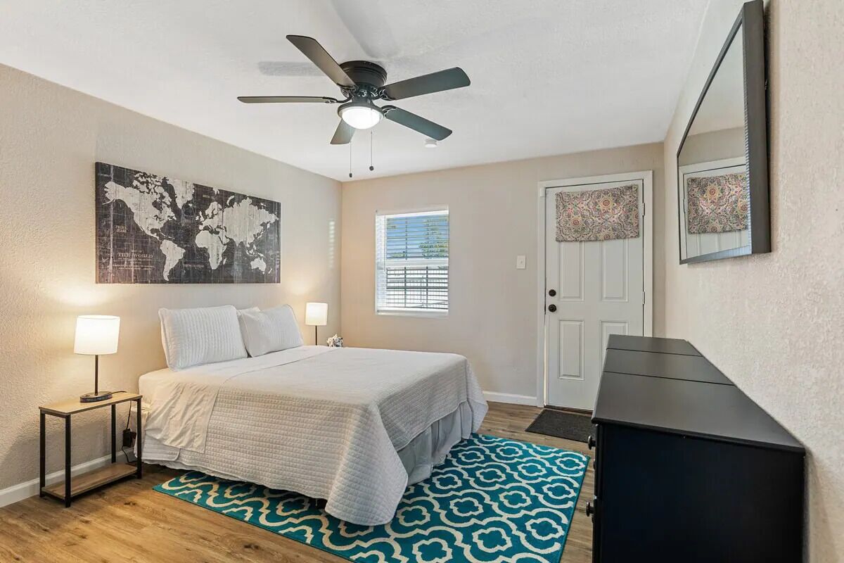 Relax in this cozy, well-appointed bedroom with a brand-new queen-sized bed, plush linens, blackout curtains, ceiling fan, and a stylish window-side ottoman. The room offers privacy and security with its own lock and key.