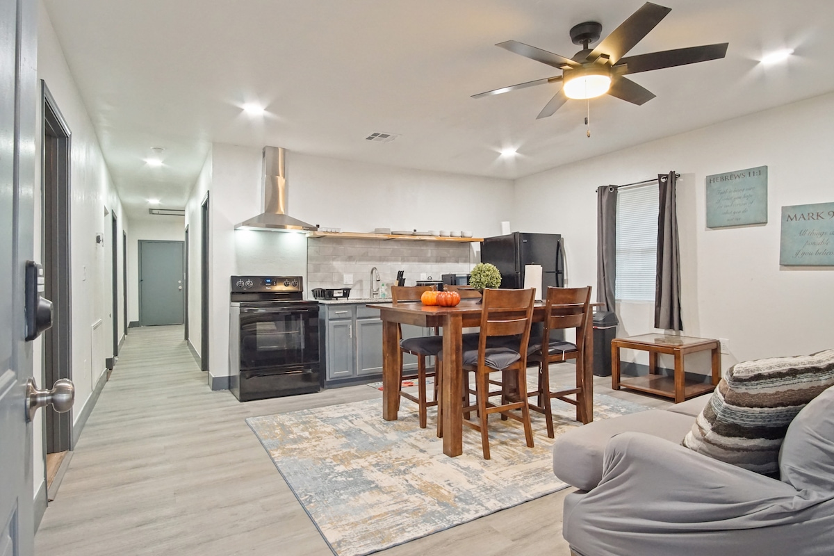 Guests will be able to access a reserved parking space (The far West/ left parking space; left of the West carport). Guests will use a key from the lockbox (lock box is found in the foyer) to access the Gray Suite through door labeled # 1. Once inside the Gray Suite. Guests will be able to access their own private room and full bathroom with no shared spaces with other guests.