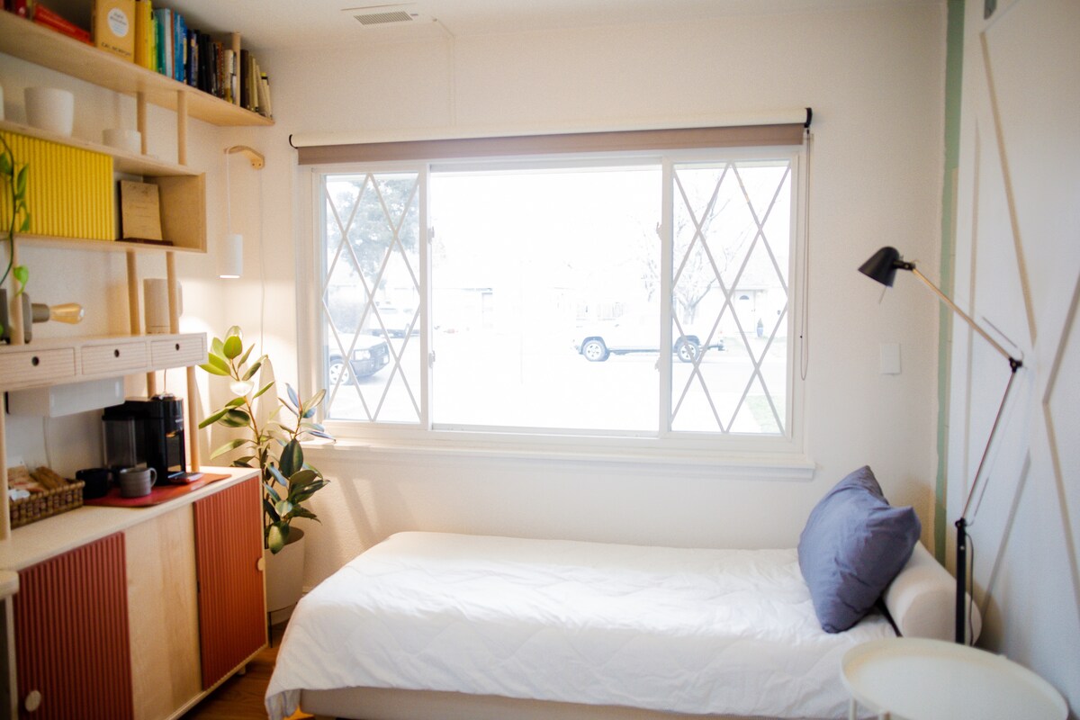 Your room will be equipped with a Nespresso machine, as well a kettle, breakfast items, and a selection of teas. The tap water is cleaned and can be used as much as needed from the sink. The very comfortable CB2 daybed with an additional plush topper can be made into an oversized queen bed, or left as a single twin.