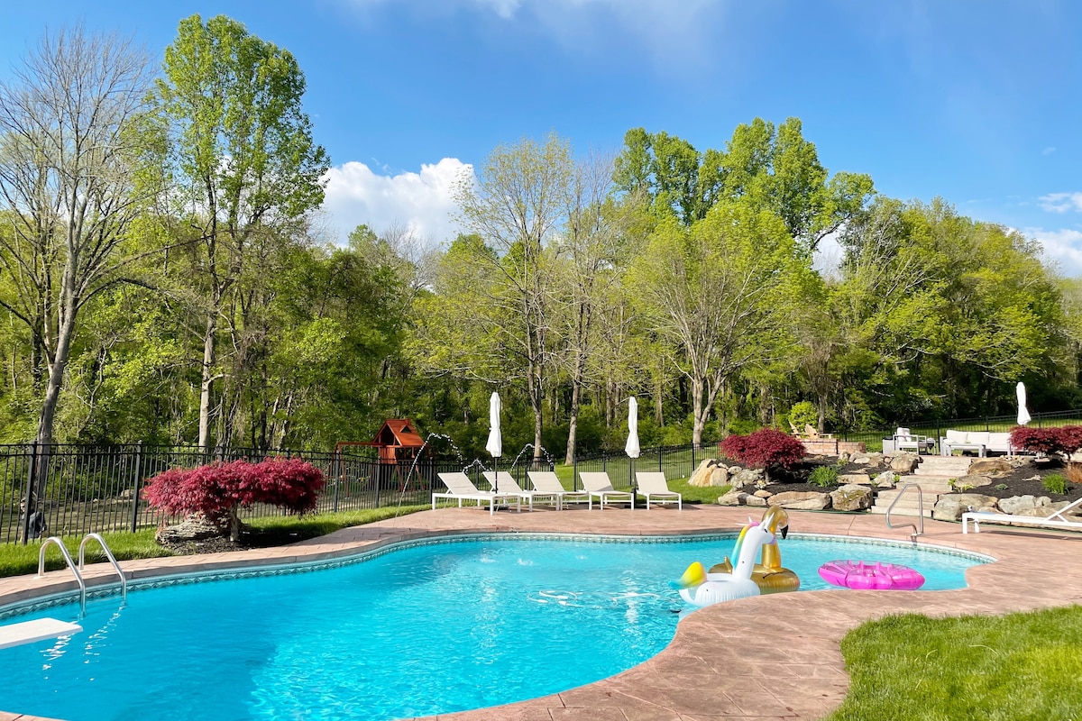 Welcome to our beautiful, modern, country estate! We acquired and remodeled this property to spend time with friends and family and want to see others enjoy it in the same way. Nestled on 10 acres, the manor is in the middle of a beautiful private area in the middle of huge fields alongside the woods. The landscaped patio and pool finish the safe and serene setting. Indoor and outdoor fireplaces help keep you warm and cozy in the winter. Kids stay busy with the playroom, pool, bouncy house, games and toys.