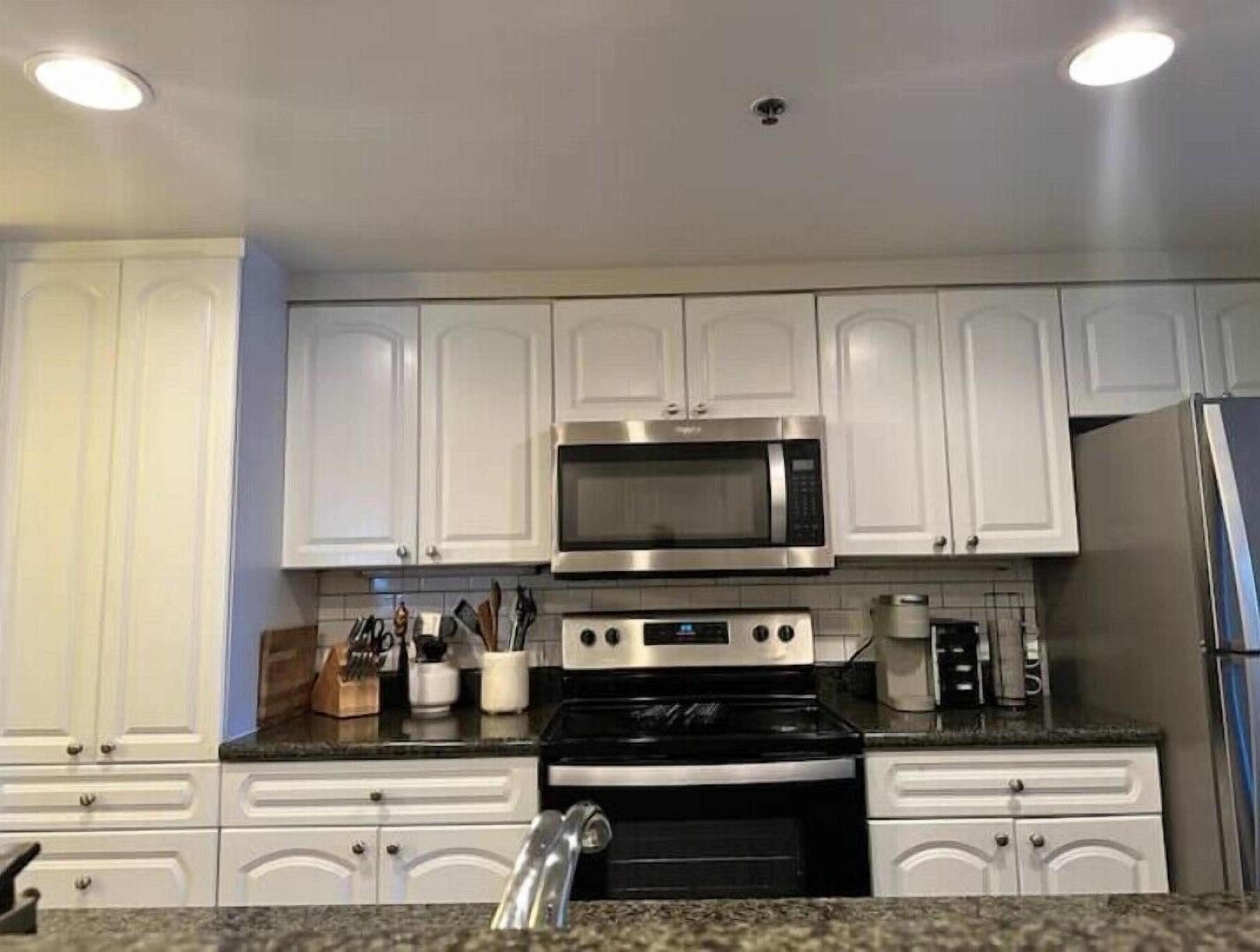 Entering the unit, you will find the living room where you can cozy up and chill on our reclining sofas while enjoying the electric fireplace and watching your favorite tv show.