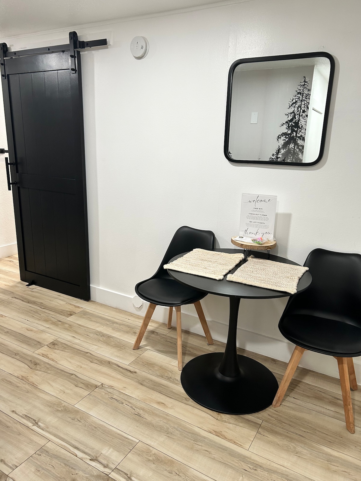 The space has an open-air cabin feel with wood plank walls, exposed beams, and decor inspired by the forest just outside. In the great room, you’ll find a wooden dining table, open kitchen with brand new stainless steel appliances, and a cozy living room with smart tv. Please note the home is a duplex with two units that do not share access.