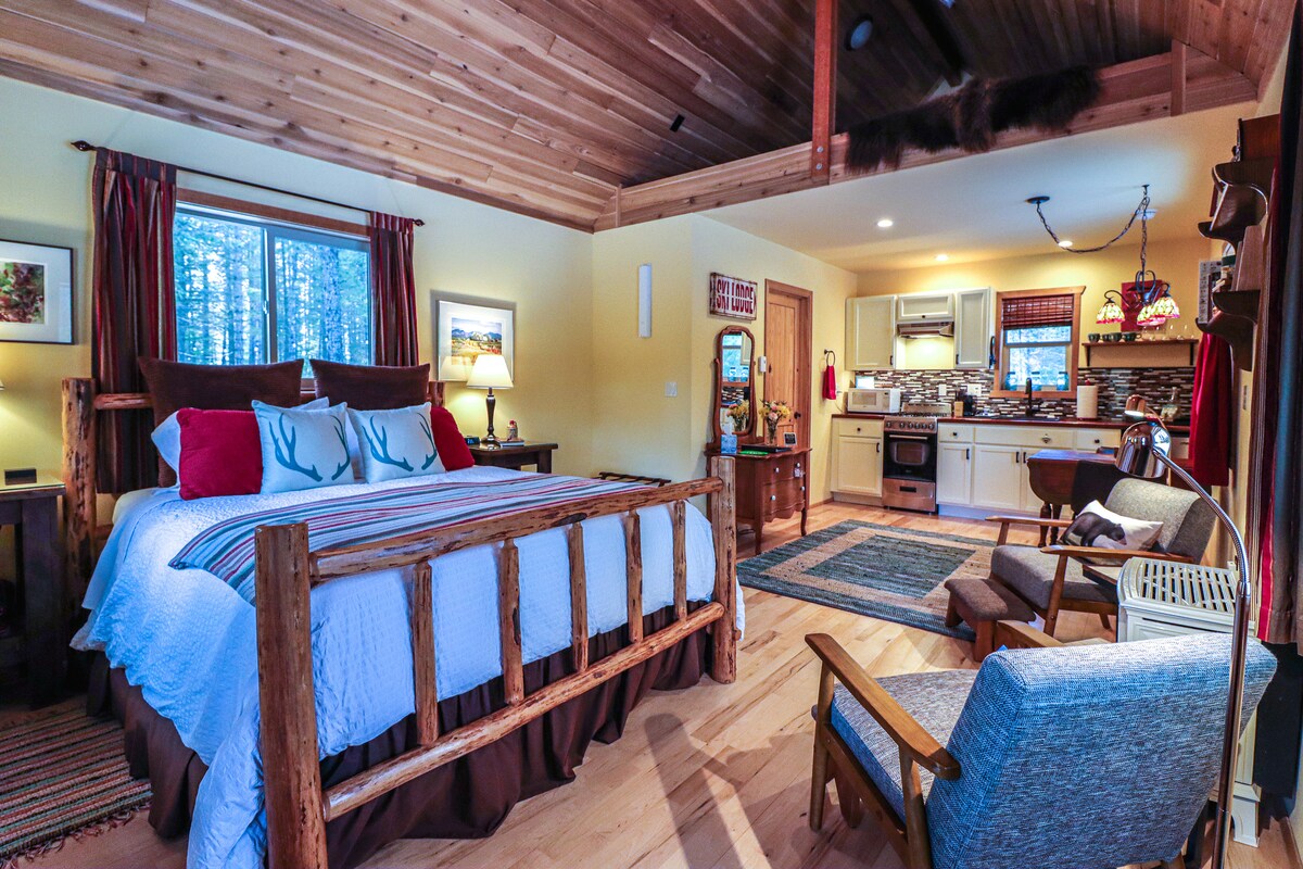 Our boho studio is connected onto our small motel, located right off of the main road. This studio has a queen size bedroom with a 55” SmartTV and USB plug ins. The kitchen has full size appliances and fully stocked with dishes. The living room has a cozy sofa and additional 55” SmartTV. This unit has 2 entry ways, one into the kitchen, one into a large mud room, perfect for storing snow gear! The mud room is also large enough for a twin size air mattress if you need to sleep an extra person!