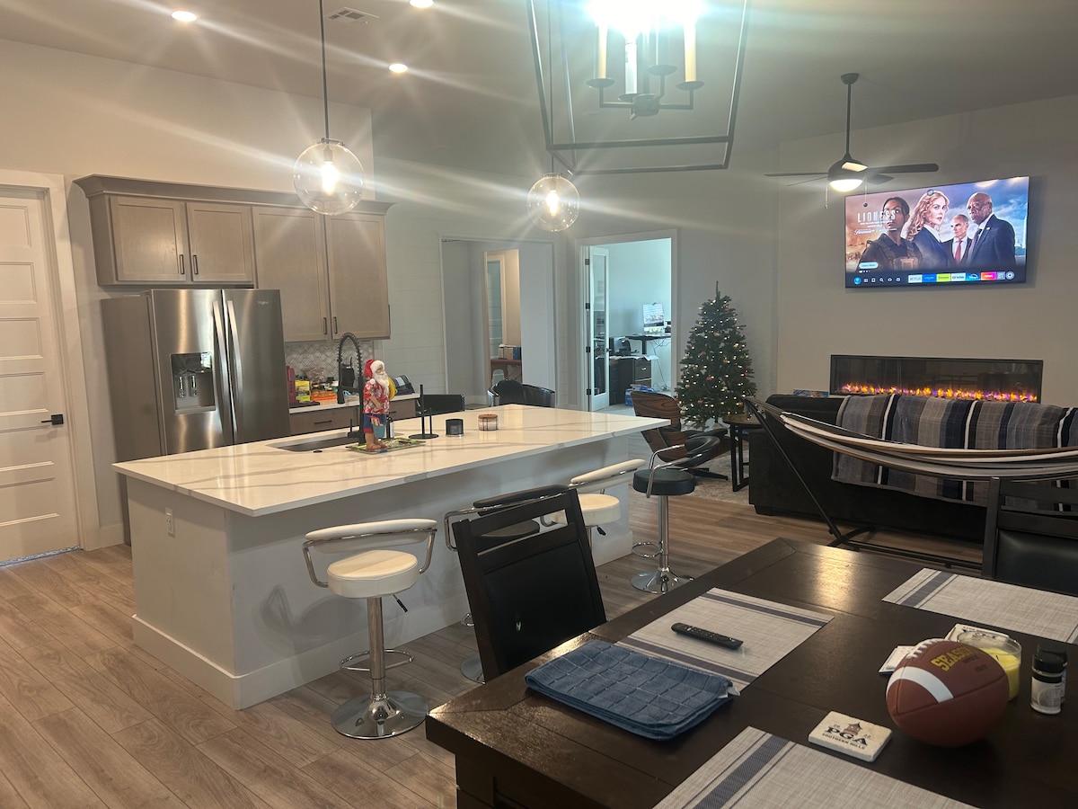 Granite counters and upgraded flooring throughout. This Airbnb comes with everything you need for a comfortable stay including a stocked kitchen, 65" TV, soap, shampoo and everything else you need for a relaxing stay.