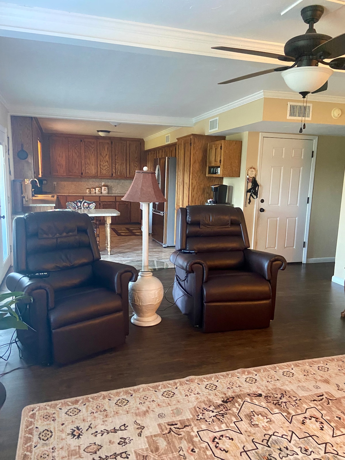 There are two living spaces with several sofas for plenty of room. Fiber internet and tv. The heat and air unit has been replaced. There are 2 complete bathrooms with 2 showers, 2 toilets, 2 sinks.