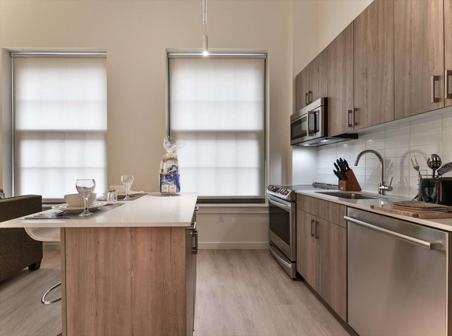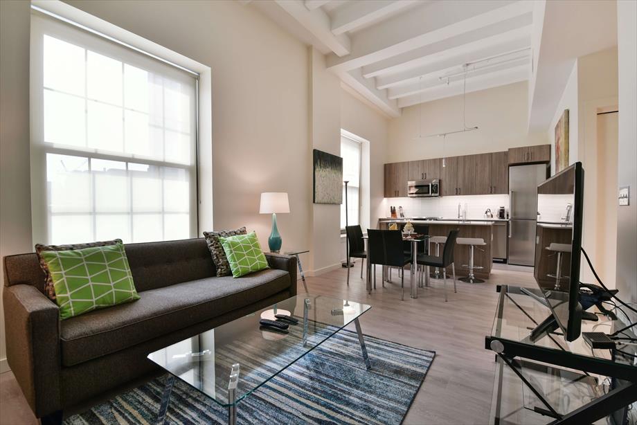 This newly designed one-bedroom apartment features floor-to-ceiling windows, hardwood floors, granite counter-tops, upgraded stainless steel appliances and front-loading washer/dryer in the residence. All beds provided are fitted with plush linen sheets and pillows. All Furnished Quarters apartments include 24/7 guest service.