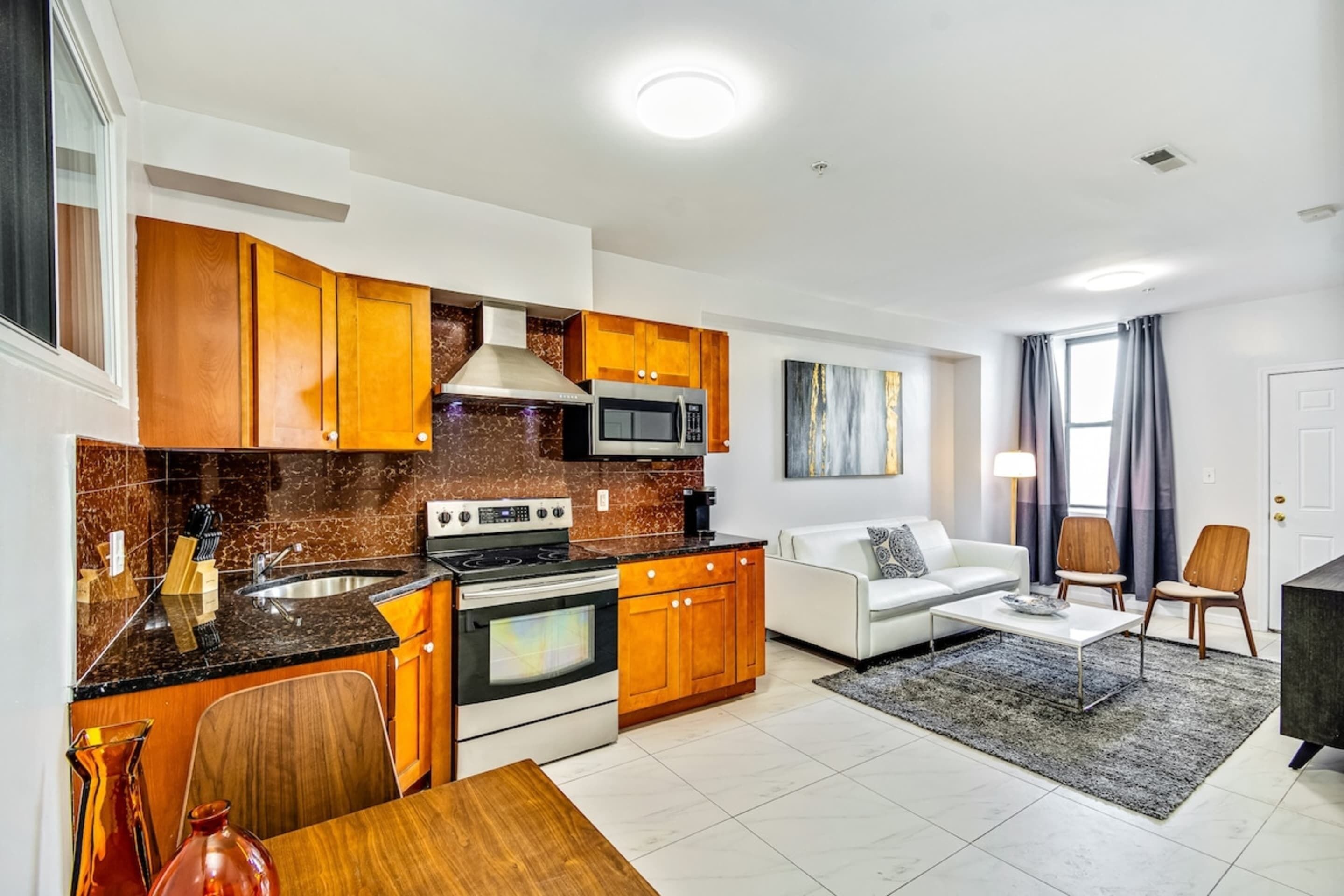Your home away from home in Philadelphia with 2 bedrooms awaits you. This lovely apartment features a king bed, a queen bed, and a cozy living room with a sofa bed. The soothing atmosphere will make you feel relaxed and right at home. With amenities like WiFi, AC, and a washing machine, your stay will be brilliant. Enjoy your time in Philadelphia at our cozy apartment.