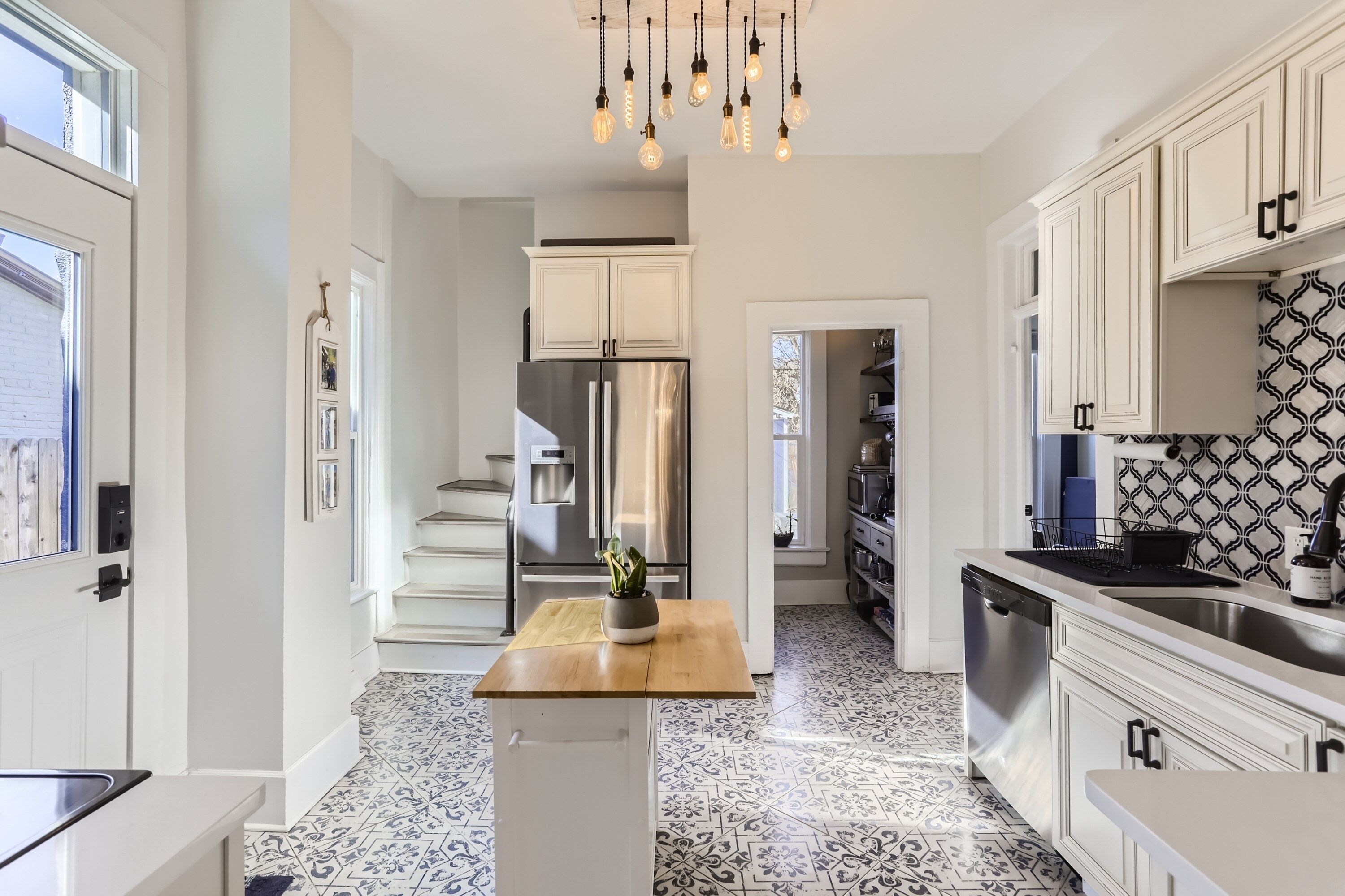 - Beautiful design touches like custom industrial steel cable handrail, beveled subway tiles in the kitchen, gorgeous decorative tiling in the bathroom, high-end white cabinets and drawers with slow closers.
